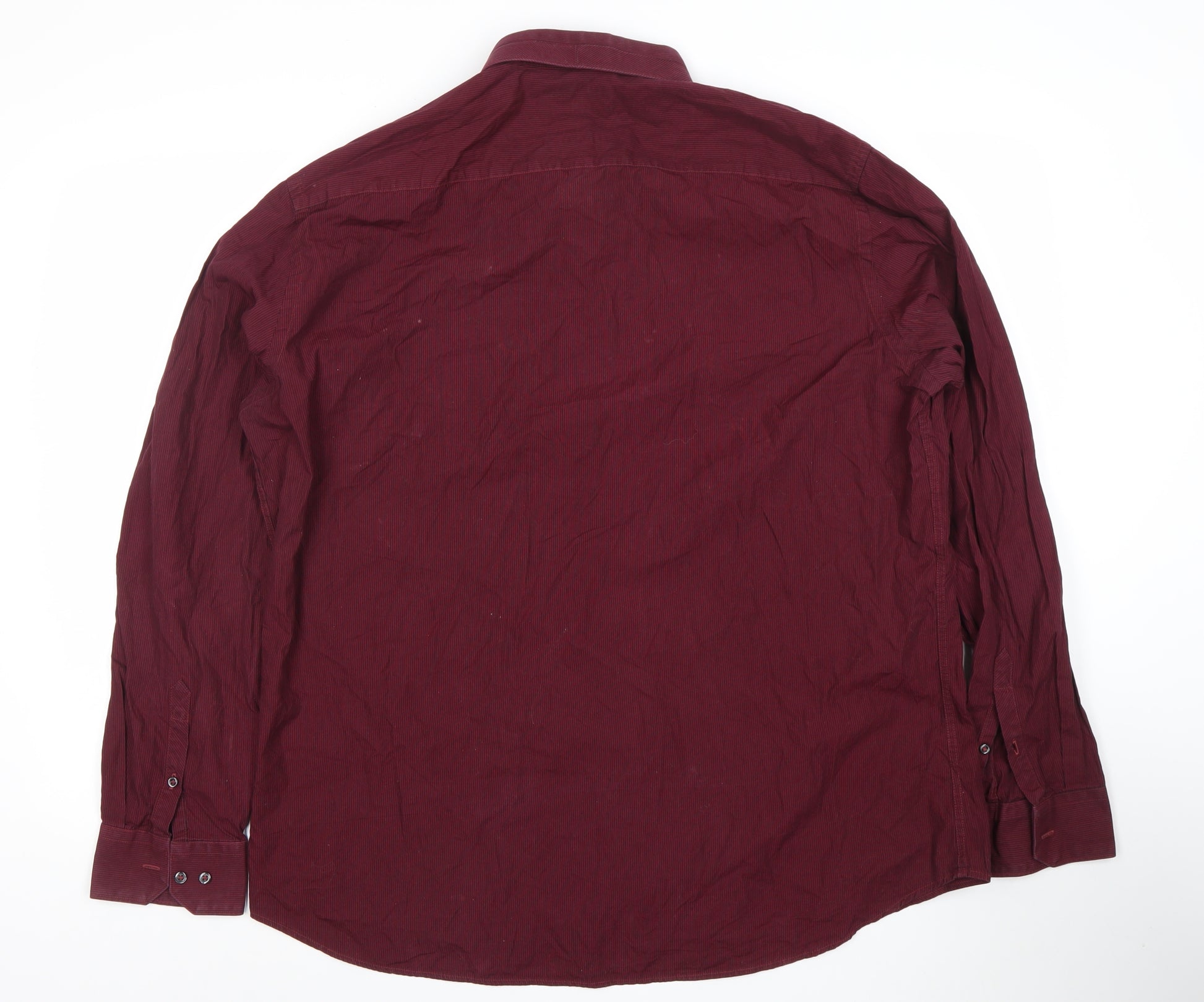 Elevate your smart wardrobe with this sophisticated men's formal shirt by Next. Crafted in a deep red striped pattern, this tailored fit shirt offers a refined and modern silhouette perfect for business, evening, and formal occasions. Made from 100% cotton, the shirt combines breathable comfort with a smooth, crisp texture that provides long-lasting wear throughout the day. It features a classic point collar, long sleeves with barrel cuffs, and secure front button fastening for a timelessly elegant appearance. The non-iron feature enhances practicality, meaning less time spent on maintenance while preserving a polished look. Designed for the modern gentleman who values subtle style and comfort, this shirt transitions seamlessly from workwear to formal evening affairs. Its tailored design ensures a flattering fit that complements various body shapes without compromising on ease of movement. Ideal when paired with dark trousers or a suit, it adds a touch of distinguished charm to any ensemble. The shirt remains in very good condition with only light creasing from previous wear, reflecting careful ownership. Whether you're attending an important meeting or a special event, this Next red striped dress shirt provides a reliable blend of style and functionality. With premium construction and a striking yet understated colour, it’s an effortless choice for bringing refinement to any occasion. Affordable yet stylish, this high-quality piece offers great value for those looking to refresh their formal collection with classic British design excellence.