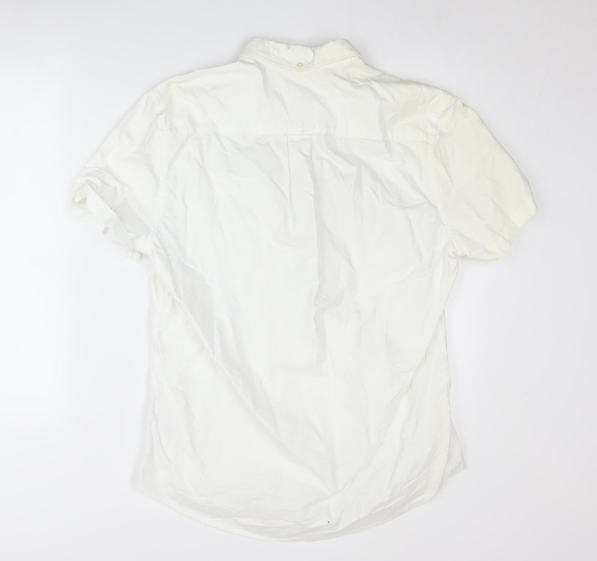 This men's white button-up shirt from Next is crafted from 100% cotton, providing a comfortable and breathable feel. The shirt features a regular fit, short sleeves, and a classic button-down collar, making it a versatile addition to any casual wardrobe. Its solid white colour pairs well with various outfits, especially in spring and summer. Despite a light stain on the front, the shirt remains in good condition, offering great value for a refined casual look. Machine washable for easy care.