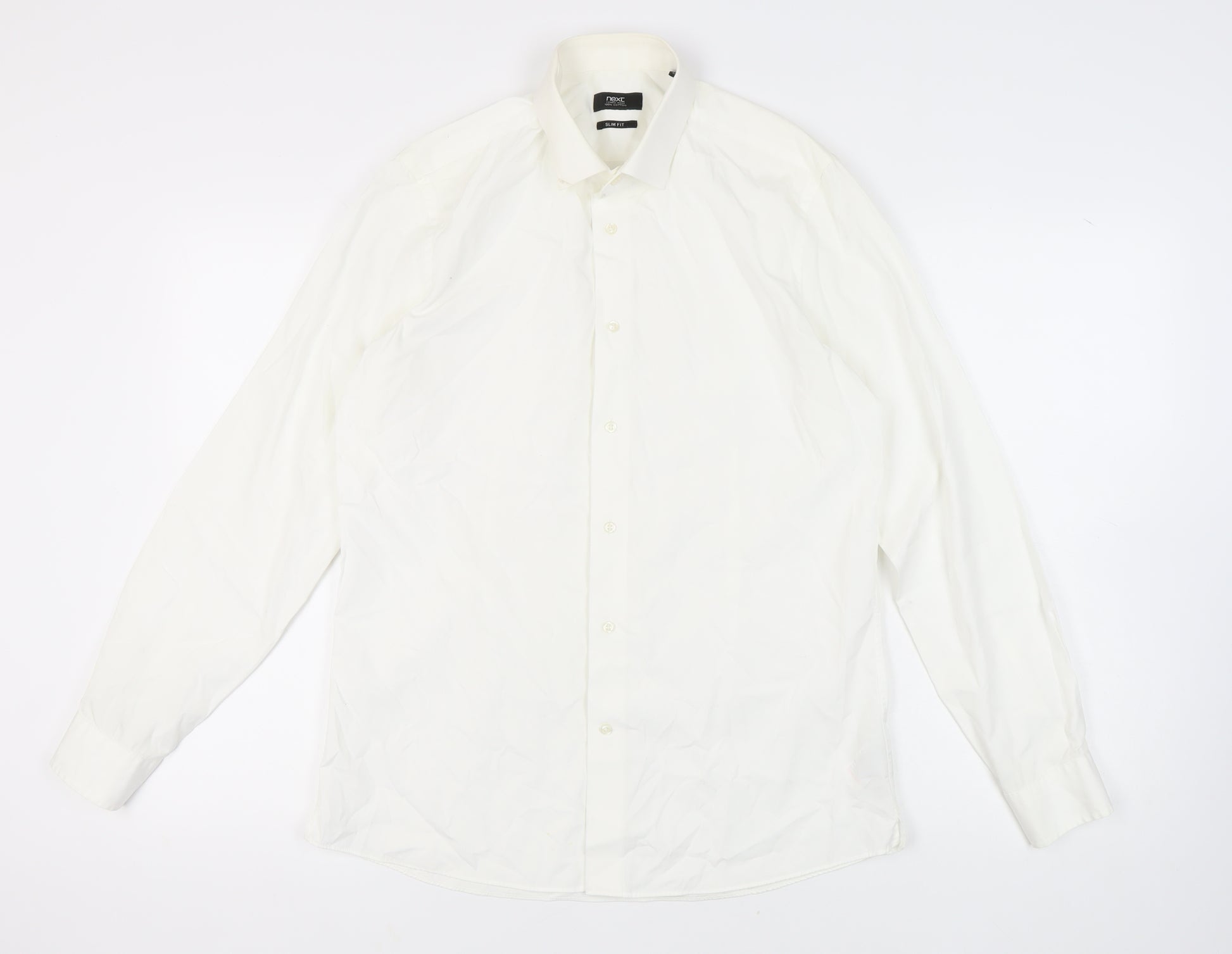 Introducing the Next Men's White Slim Fit Dress Shirt, a staple in sophisticated apparel for the modern man. Crafted from exquisite 100% cotton, this shirt offers unparalleled comfort and a crisp, clean look suitable for any formal occasion. Its solid white colour makes it a versatile addition to any wardrobe, allowing effortless pairing with a variety of suits and ties.The slim fit design contours your shape while maintaining comfort, offering a flattering silhouette that enhances your physique. Ideal for business meetings, formal events, weddings, or daily office wear, this shirt is as functional as it is stylish. The long sleeves and point collar bring an element of classic elegance, while the barrel cuffs add a touch of timeless sophistication.For added convenience, this dress shirt is machine washable, ensuring ease of care and long-term durability. Whether you're heading to the office or an important event, the Next Men's Dress Shirt keeps you looking polished and professional without sacrificing comfort.Designed with attention to detail and quality workmanship, this shirt promises to be a reliable choice in your clothing repertoire. Its new condition with tags guarantees authenticity and quality, making it a valuable addition to any gentleman's collection. Elevate your everyday look with the Next Men's White Slim Fit Dress Shirt, where style meets substance.
