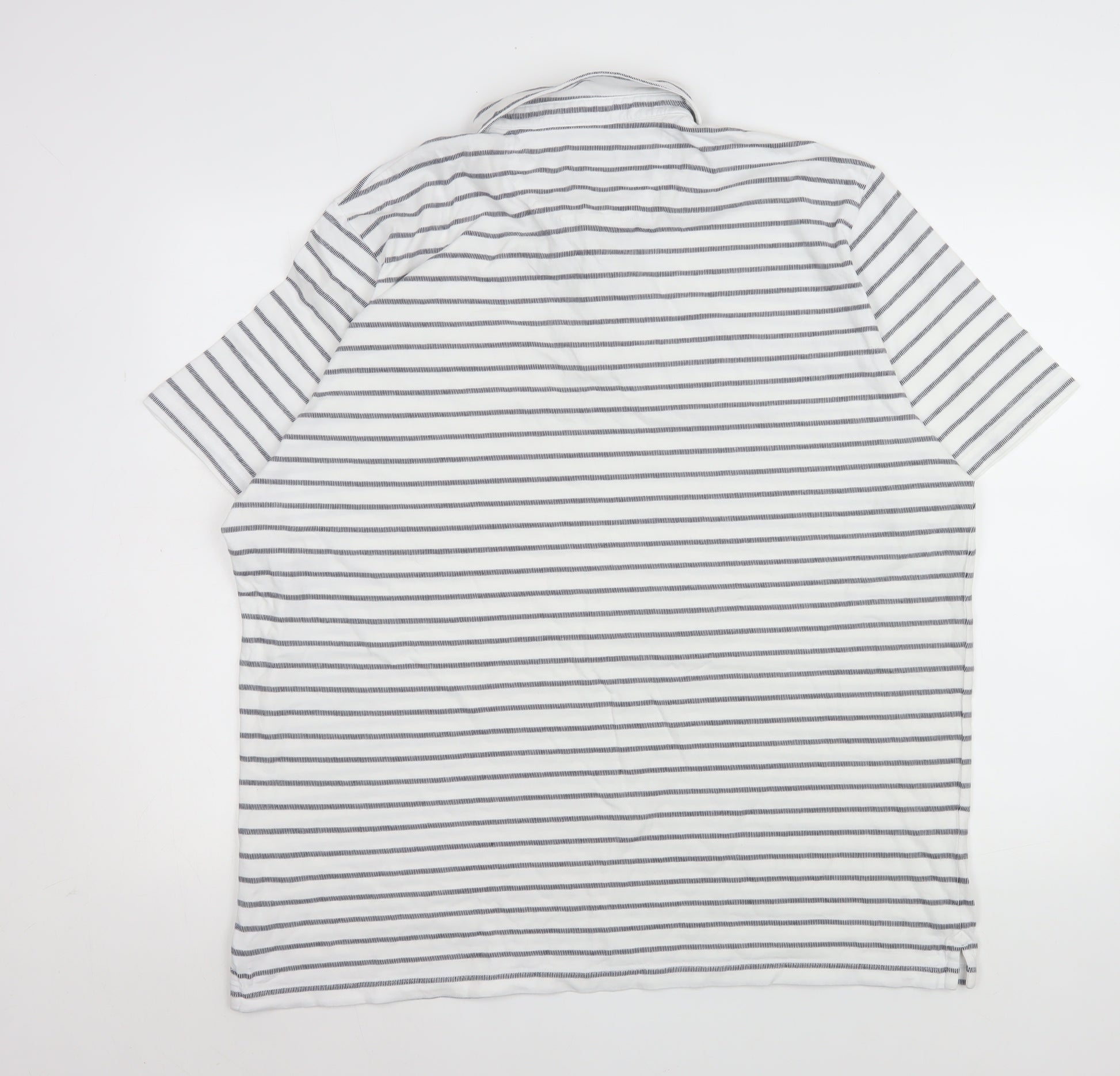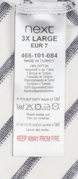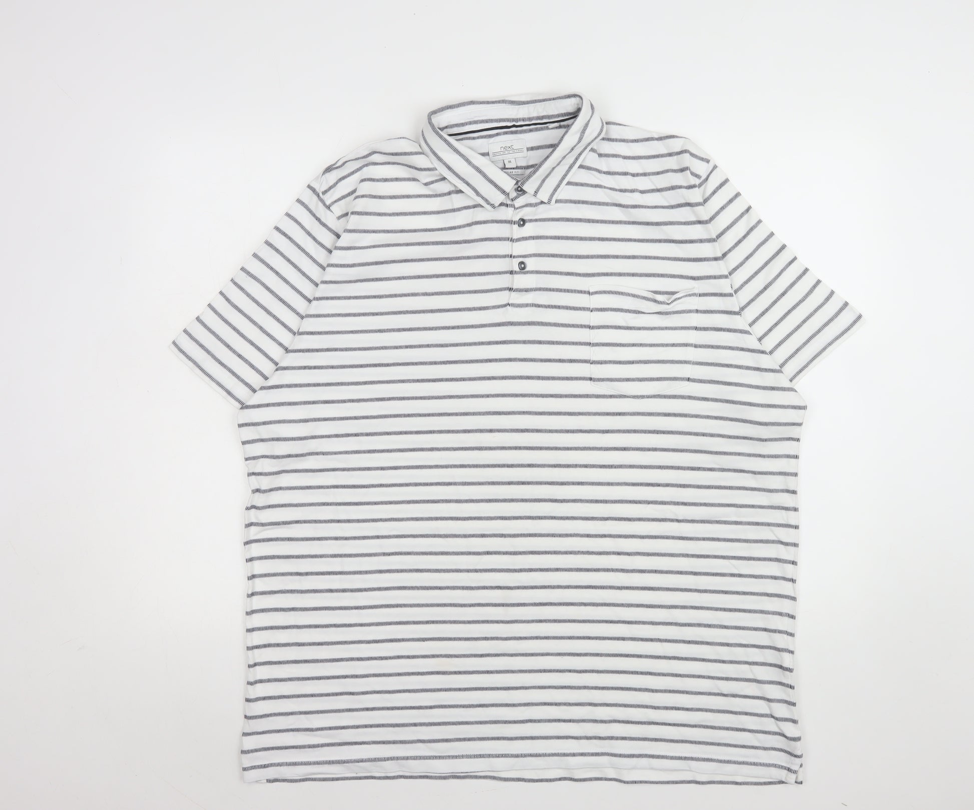 Step into effortless style and comfort with this Next men's 3XL short sleeve polo shirt, the perfect choice for casual wear throughout the warmer months. Designed in a timeless horizontal stripe pattern in white with subtle grey accents, this polo features a classic collared neckline and a three-button placket for a clean, modern finish. Crafted from 100% pure cotton, the fabric feels soft and breathable against the skin, ensuring easy all-day comfort whether you're heading to lunch, relaxing at home, or enjoying a sunny weekend outing. The shirt’s relaxed regular fit ensures a flattering drape for versatile styling, while the front chest pocket adds a touch of detail that enhances its laid-back appeal. The point collar, in keeping with the polo's smart-casual design, provides a polished edge that makes it ideal for teaming with jeans, chinos, or shorts. Machine washable and easy to care for, this top combines practicality with style for a low-maintenance wardrobe staple. As part of Next’s quality menswear range, this piece reflects simple sophistication that's well suited to both every day and relaxed evening wear. Its condition remains excellent, showing only very light signs of previous handling, with no stains or damage. A versatile, breathable, and comfortable essential, this 100% cotton polo shirt is ideal for men who value refined simplicity in their casual wardrobe. Bring a touch of cool, classic design to your collection with this superbly crafted striped polo—perfect for casual outings, smart-casual lunches, or relaxed weekends. Whether paired with denim for a laid-back look or dressed up with chinos for a semi-formal feel, it offers timeless appeal and effortless sophistication for the modern man.