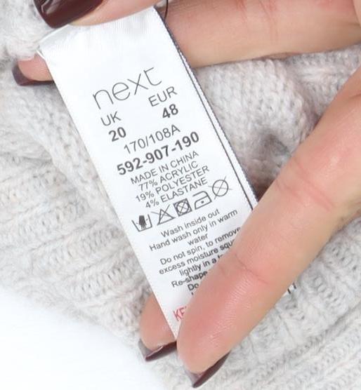 Elevate your wardrobe with this elegant women's jumper from Next, perfect for both casual and special occasions. Designed in a flattering UK size 20, this beige pullover features delicate beaded accents across the shoulders, adding a touch of subtle sparkle to your everyday style. The classic high neckline and long sleeves offer a warm and sophisticated look that transitions beautifully from daywear to evening outings. Crafted from a soft and comfortable knit blend of acrylic, polyester, and elastane, this jumper combines lightweight stretch with cosy texture, making it ideal for layering through the autumn and winter months. Its fine tight-knit construction ensures durability while maintaining a smooth, refined finish that feels gentle against the skin. The neutral beige hue pairs effortlessly with jeans, trousers, or skirts, making it a versatile addition to your seasonal wardrobe. Whether you're heading to a relaxed weekend brunch or dressing up for a festive occasion, this Next jumper provides both comfort and understated glamour. Gently worn with no significant signs of wear, the garment retains its original shape and embellishment detail. Hand wash only is recommended for longevity. Add timeless sophistication and subtle charm to your knitwear collection with this beautifully designed piece from Next.