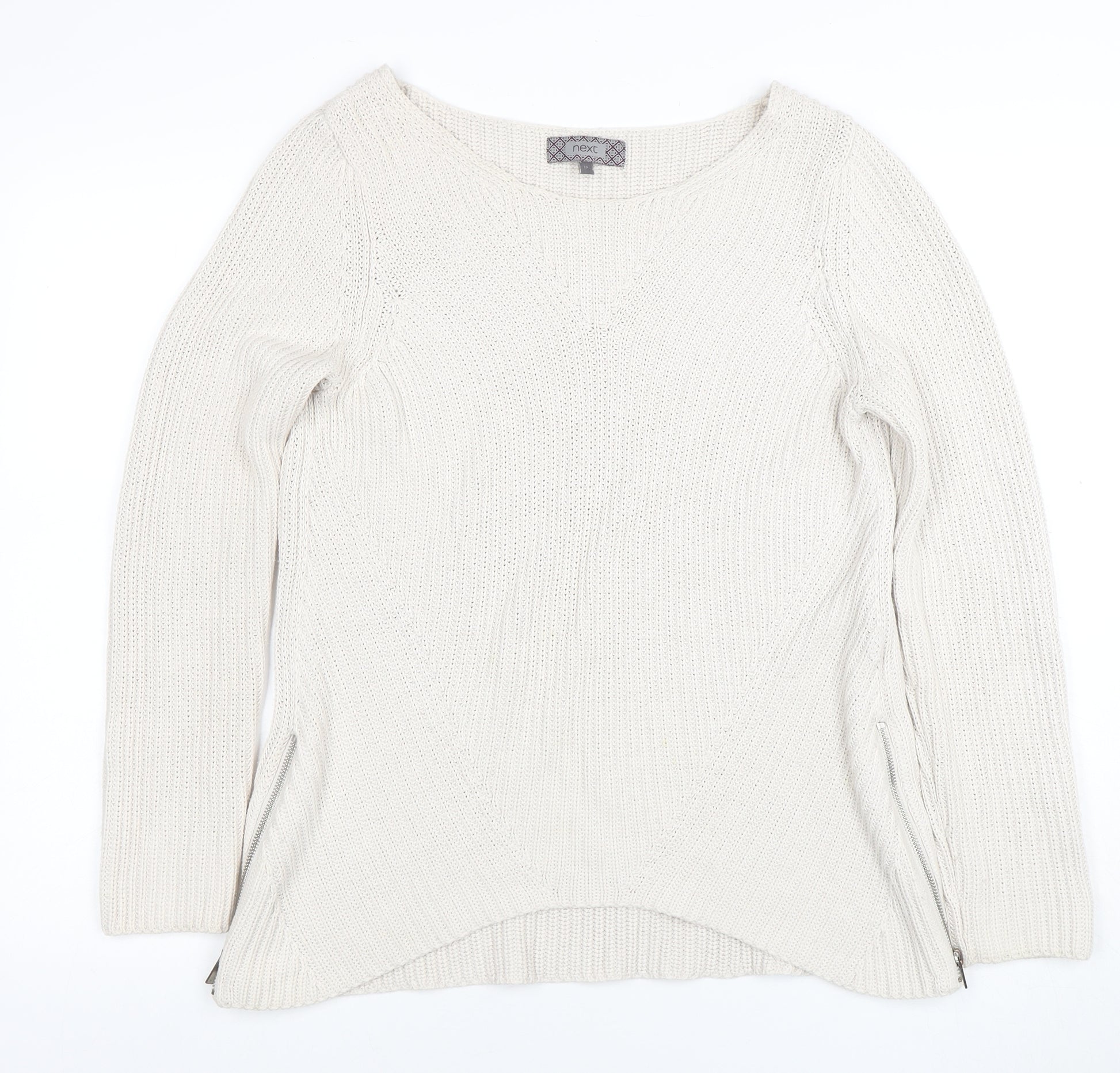 Stay effortlessly chic and cosy with this beautiful ivory jumper from Next. Designed for women seeking both style and comfort, this soft knit pullover is crafted from a quality cotton and acrylic blend, offering a breathable yet warm texture perfect for cooler seasons. The relaxed fit and long sleeves deliver everyday comfort, making it an ideal addition to your casual wardrobe. Its crew neckline keeps the look simple and versatile, while the chunky-knit texture adds visual interest for a timeless style that pairs easily with jeans, skirts, or tailored trousers. The silver zip accents on the sides add a subtle modern twist, giving you the option to customise your fit and silhouette as desired. Suited for autumn, winter, and early spring wear, it’s perfect for layering under coats or over collared shirts. This jumper is easy to care for, being fully machine washable, which makes it practical for regular use. Whether you’re heading to a relaxed gathering, a day in the city, or a cosy evening at home, this Next women’s jumper offers reliable elegance and warmth. In excellent pre-loved condition with minimal signs of wear, it’s a fantastic choice for those who appreciate quality high-street style at a great value. Perfect for pairing with classic denim or chinos, this piece represents the ideal mix of texture, comfort, and understated style for modern wardrobes.
