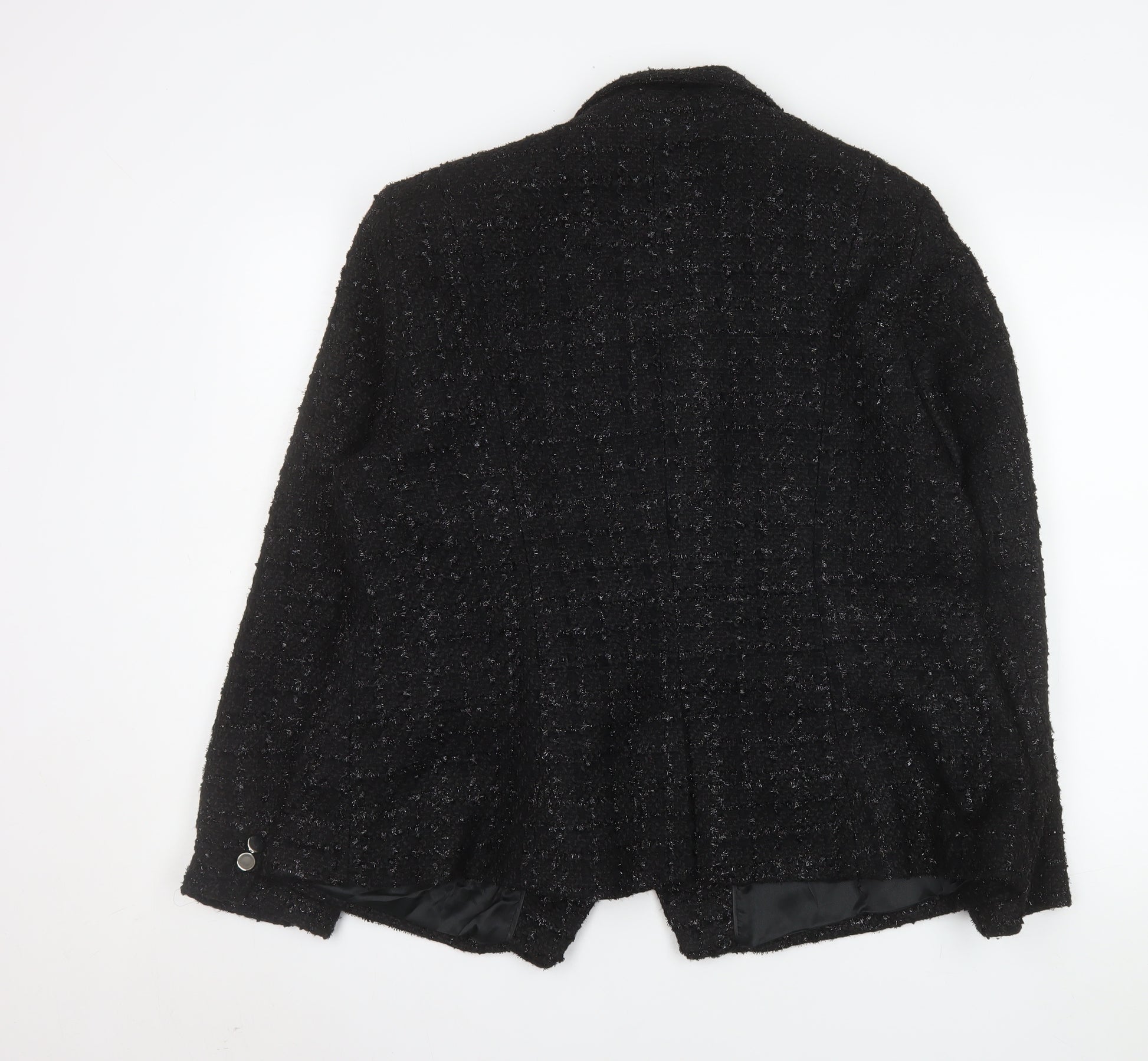 This elegant women’s black bouclé blazer from Next offers a timeless and sophisticated addition to any wardrobe. Expertly tailored in a regular fit, this jacket is crafted from 100% polyester with a beautifully textured bouclé finish that gives it a luxurious look and feel. Designed with a classic double-breasted front featuring six metallic buttons, notched lapels, and front flap pockets, this piece delivers the perfect blend of modern refinement and traditional structure. The jacket is fully lined in smooth polyester for comfort and durability, making it ideal for professional, formal, or evening wear.Perfect for autumn and winter, this blazer can elevate both business and smart-casual outfits. Wear it over a blouse with tailored trousers for an office-ready look, or pair it with jeans and heels for an effortlessly chic weekend ensemble. The soft yet structured fabric provides a flattering silhouette that complements the feminine shape while remaining comfortable for extended wear. The subtle check-like pattern within the bouclé weave adds texture and dimension, creating visual interest without being overpowering.In excellent pre-owned condition with minimal signs of wear, this Next blazer remains stylish and versatile. Suitable for a range of occasions including business meetings, formal events, and evening outings, it’s a wardrobe essential for the modern woman who values both elegance and practicality. With its quality construction and polished aesthetic, this black double-breasted blazer is a lasting investment piece that adds sophistication to any outfit.