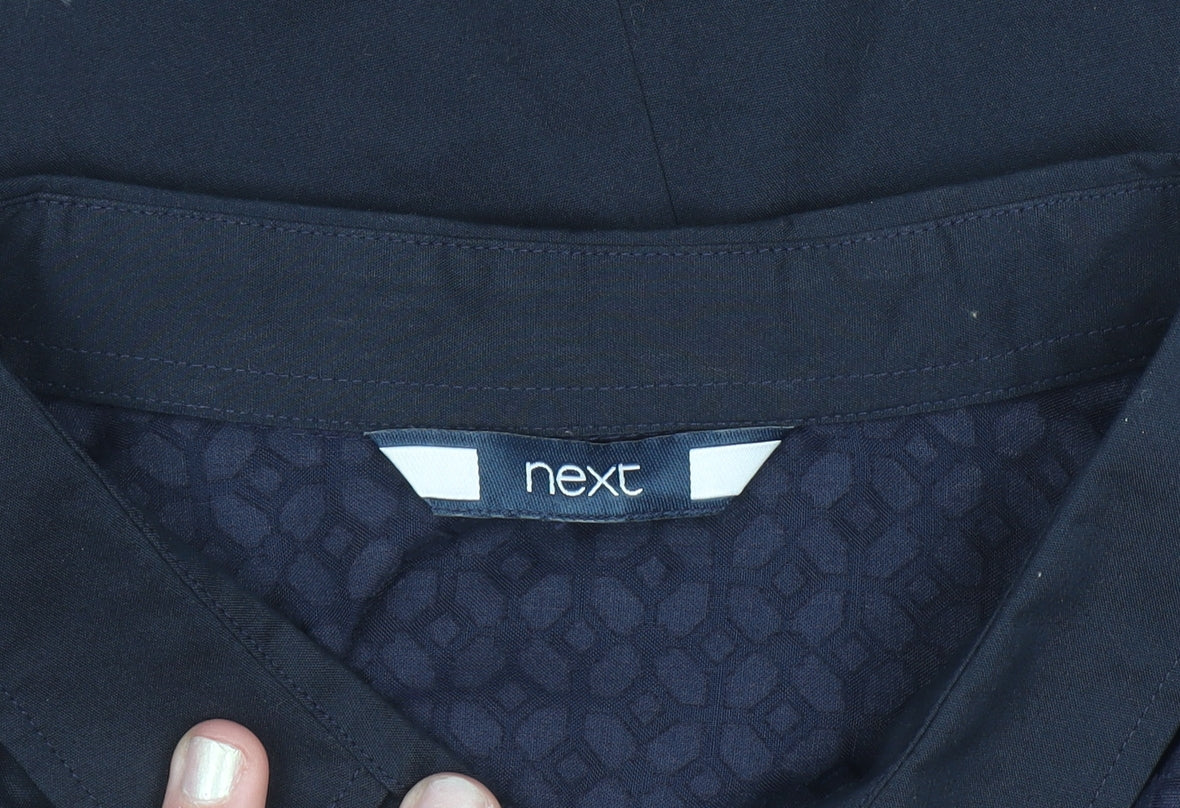 This elegant sleeveless blouse from Next effortlessly combines smart tailoring with lightweight comfort, making it an ideal addition to any modern wardrobe. Crafted from a high-quality blend of cotton, polyester, and elastane, the fabric offers a breathable feel with just the right amount of stretch for a flattering fit. The collared neckline and button front give it a clean, polished look suitable for both work and casual outings. Designed in a deep navy-blue shade, the blouse pairs beautifully with skirts, trousers, or jeans, offering versatile styling options for different occasions. The woven texture and neat tailoring add subtle structure without compromising comfort, while the soft finish ensures easy all-day wear. Perfect for spring and summer, this piece transitions seamlessly from office wear to weekend attire. It’s machine washable, ensuring practical care with long-lasting freshness. The sleeveless design makes it ideal for layering under a blazer or cardigan, allowing for adaptable style whatever the weather. This women’s UK size 14 blouse maintains its shape well, offering a regular fit that suits a variety of body types. With light signs of general wear and no noticeable flaws, it remains in excellent condition. This timeless Next top provides effortless sophistication while maintaining comfort and quality, making it a wardrobe essential. Perfect for everyday office looks, business casual events, or simply elevating your day-to-day style, this navy collared blouse will remain a go-to favourite season after season.