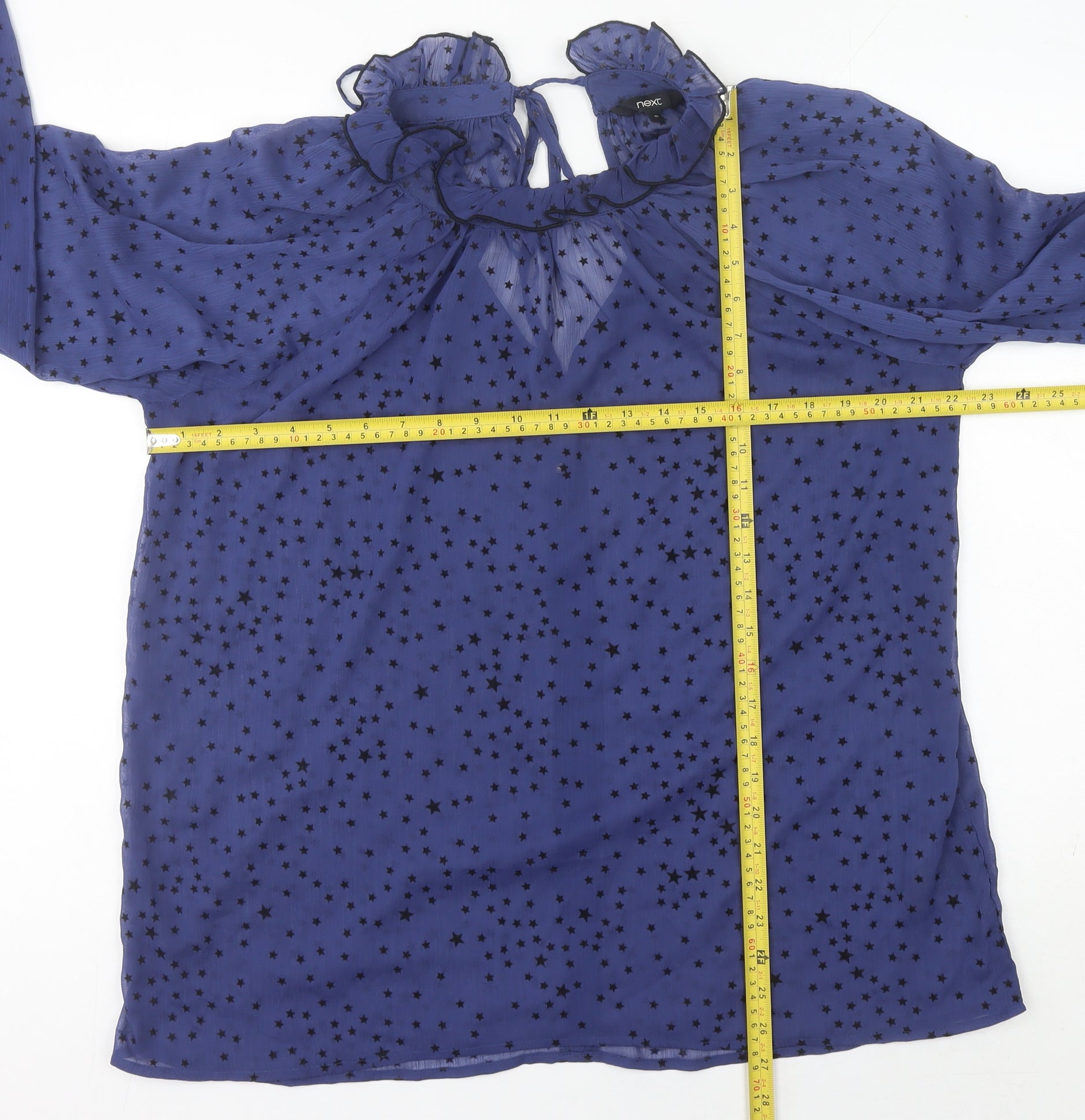 Elevate your wardrobe with this stunning women’s blue star print chiffon blouse from Next. Crafted in a lightweight and sheer 100% polyester chiffon fabric, this blouse offers both style and comfort, making it a perfect choice for spring and summer wear. The rich blue base is adorned with an all-over black star print, creating a celestial-inspired look that is on-trend and versatile. The elegant high neckline is detailed with playful ruffles, adding a touch of femininity, while the tie closure at the back ensures a subtle keyhole effect. Featuring long puff sleeves with gathered ruffle cuffs, this tunic-style blouse delivers a graceful silhouette that effortlessly transitions from day to night. The regular fit flatters without clinging, making it comfortable for all-day wear. Perfect for casual outings, parties, or even a stylish evening get-together, this blouse pairs beautifully with jeans for a relaxed look or tailored trousers for a dressier ensemble. Easy to maintain, it is machine washable for convenience. With its timeless design and high-quality construction, this blouse is sure to become a cherished piece in your collection. In excellent pre-owned condition, showing light wear but no visible flaws, it offers great value and style at an affordable price. Add this starry statement piece to your wardrobe and bring some effortless elegance to your outfits.