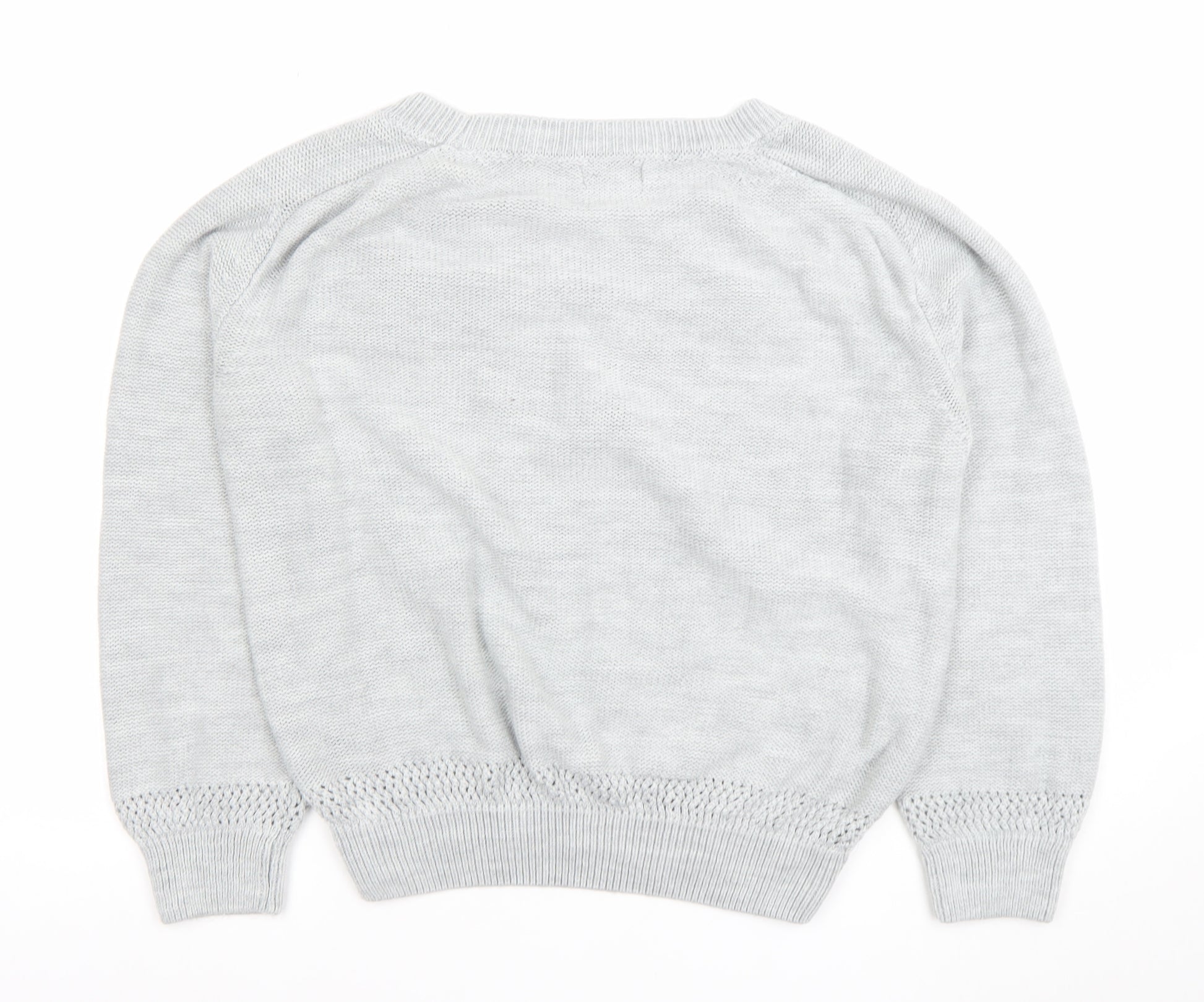 Add a touch of playful charm to your everyday wardrobe with this lovely women’s grey jumper from Next. Crafted with soft and breathable cotton, viscose, and nylon blend fibres, this pullover offers superb comfort and a lightweight feel, making it perfect for layering across seasons. The jumper features a classic crew neckline and long raglan sleeves for a relaxed yet flattering fit. Chic cream bow accents on the front add feminine detail, elevating this simple piece into something stylish and unique. Designed in a subtle light grey shade, it pairs beautifully with jeans, skirts, or tailored trousers, effortlessly fitting into casual and smart-casual looks. The soft knit fabric provides gentle stretch and shape retention, ensuring you stay comfortable all day long. The ribbed hem and cuffs add structure, while the delicate texture detail along the waistband gives it a refined edge. Ideal for the cooler months of autumn and winter, or layered under a jacket in spring, this jumper is a versatile piece you’ll reach for time and time again. Machine washable for easy care, it maintains its shape and softness after every wear. In excellent pre-owned condition with only minimal signs of gentle wear and no visible flaws, this jumper strikes the perfect balance of quality and style. Its classic design and charming detailing make it suitable for workwear, relaxed weekends, or cosy evenings out. Whether you’re dressing up for a lunch date or keeping things simple at home, this Next women’s grey bow knit jumper is a must-have addition to your knitwear collection.