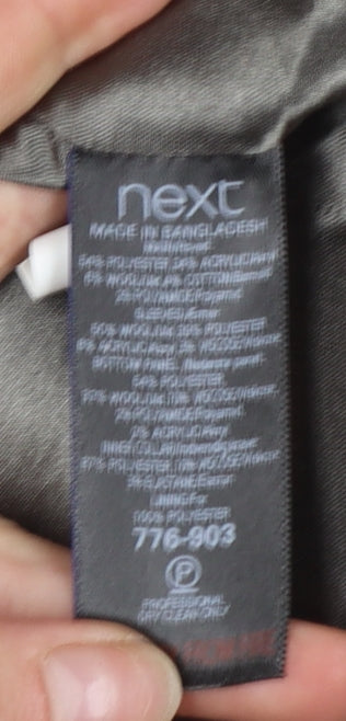 This elegant women’s grey coat from Next offers both warmth and timeless style, perfect for the cooler seasons. Crafted from a soft blend of wool, polyester, and acrylic, it features a distinct two-tone herringbone texture that creates a sophisticated visual contrast. The flattering mid-length cut offers versatile wear, easily paired with workwear or casual outfits. Designed in a contemporary motorcycle-inspired style, it includes an asymmetric full zip fastening, three practical zipped pockets, and sleek metallic accents. The coat is finished with a structured collar, adding to its polished appeal, while the soft polyester lining provides added comfort and insulation. Suitable for autumn and winter, this piece is ideal for women looking to maintain a refined yet modern look. The tailored cut ensures a regular fit that complements a variety of body shapes without feeling restrictive. Its durable materials promise long-lasting quality, while the attention to detail in the stitching and finishes gives it a premium feel characteristic of Next outerwear. Stylish, versatile, and effortlessly chic, this grey coat transitions seamlessly from day to evening, making it a must-have for your cold-weather wardrobe. Pair it with boots and chunky knits for a casual day out or layer it over a blouse and trousers for a professional setting. In excellent pre-owned condition with only light general wear, this coat remains in beautiful shape, ready for its next chapter. A great opportunity to add a sophisticated finishing touch to your wardrobe at a fraction of the original retail price.