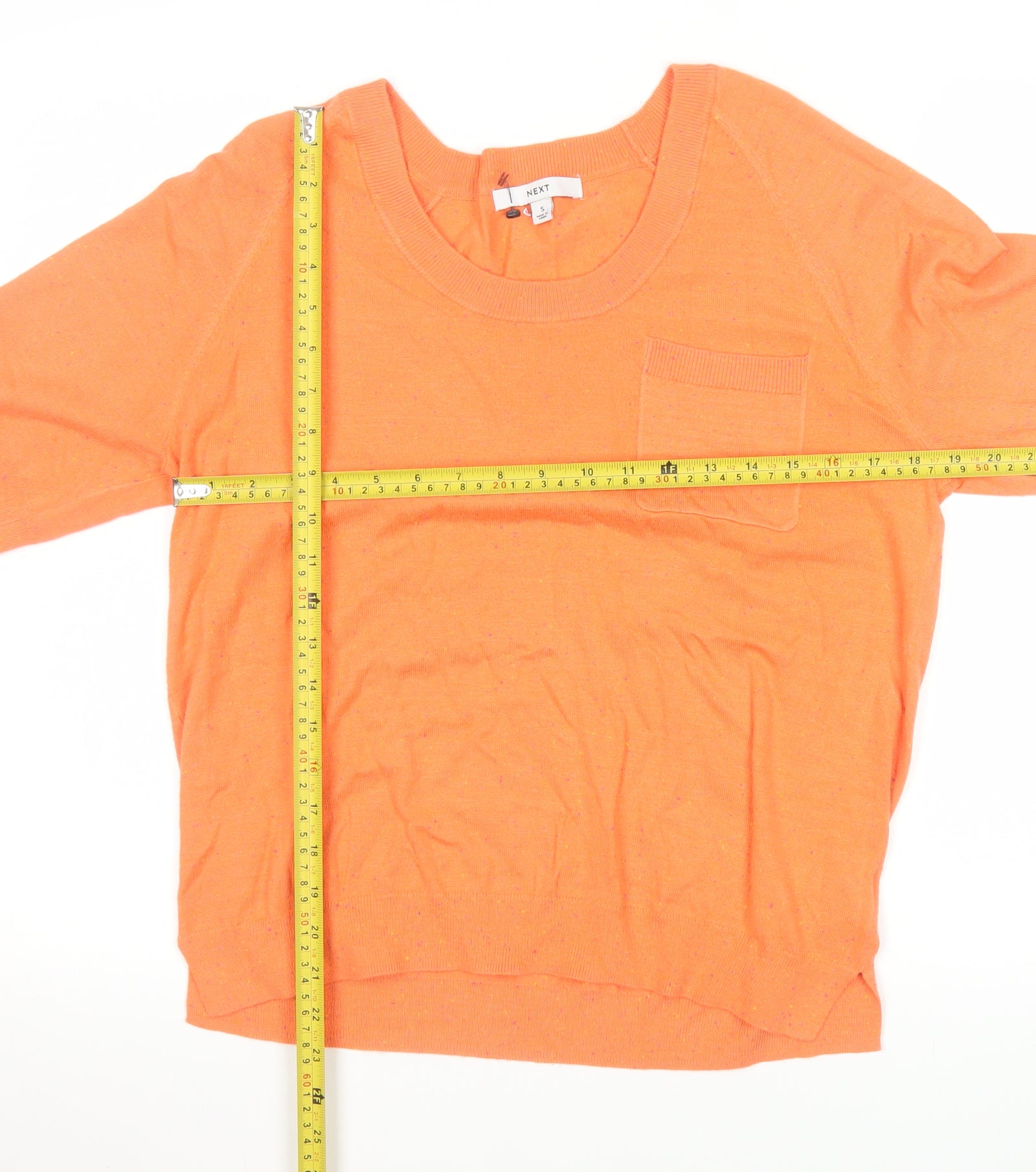 Add a splash of colour to your everyday wardrobe with this vibrant orange short-sleeved t-shirt from NEXT. Designed for women who value both comfort and contemporary style, this lightweight knitted piece offers a soft and breathable fit perfect for year-round wear. Crafted in a premium viscose and nylon blend, with a small touch of polyester, it offers a smooth feel and enough stretch for ease of movement. Featuring a classic scoop neckline and a single front pocket detail, this top balances simplicity with effortless charm, making it a versatile option for layering or wearing on its own.The relaxed fit and short sleeves create a laid-back silhouette ideal for casual days, whether you're out running errands, meeting friends, or working from home. The ribbed neckline, hem, and sleeve cuffs subtly enhance the structure, maintaining shape while ensuring comfort. The soft knit texture offers a flattering drape that complements a variety of body shapes, while the radiant orange hue brings a cheerful pop of colour to any outfit. Style this top effortlessly with jeans, tailored trousers, or a midi skirt to create an easy but refined look suitable for spring through autumn.Machine washable for easy care, this t-shirt retains its softness and appeal wash after wash. Though pre-owned, it remains in excellent condition with no visible defects, making it a fantastic value addition to your wardrobe. Perfect for those who appreciate quality basics with a modern twist, this top embodies NEXT’s signature approach to stylish simplicity. Suitable for layering beneath a blazer for smart-casual occasions or pairing with denim shorts for weekend wear, its versatility will quickly make it one of your go-to favourites. Refresh your essentials with this orange NEXT knit t-shirt and enjoy the comfort and colour it brings to your daily rotation.