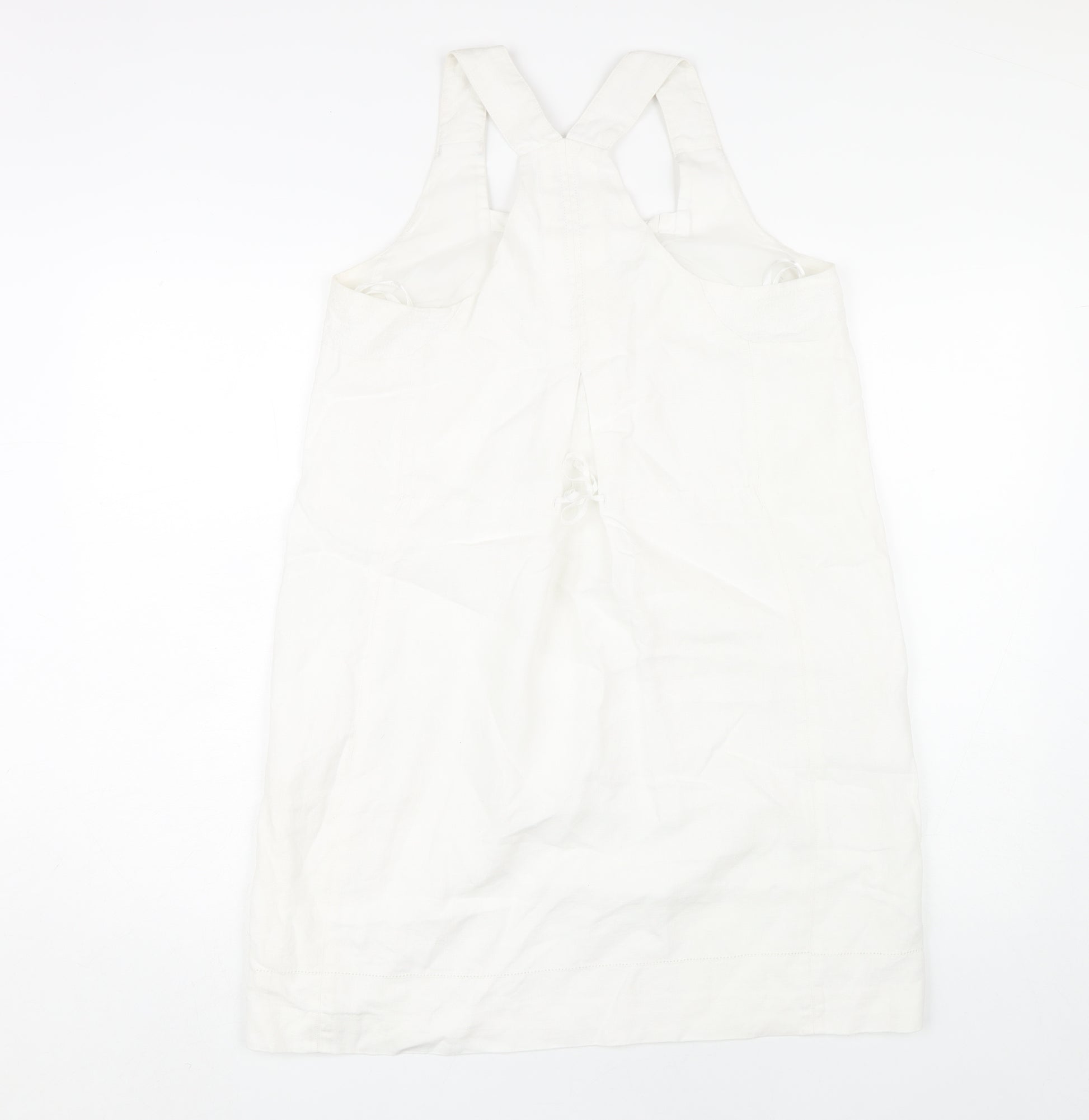 Embrace a chic casual style with this beautiful white pinafore dress from Next, perfect for summer outings. Made in a breathable 100% linen fabric, this dress ensures comfort and a relaxed look. Its strappy, sleeveless design is ideal for warm weather, creating a perfect blend of elegance and ease. The square neckline adds a modern touch, while the zip closure at the back ensures effortless wearability.This knee-length pinafore dress is tailored for women and features practical pockets, making it both stylish and functional. Designed for a regular size 10, it offers a flattering fit that complements various body types. The dress comes in a classic white hue, providing the versatility to accessorise with colourful accents or keep it simple and understated.Machine washable for easy maintenance, this dress is a great addition to your summer wardrobe. Its wrinkle-resistant nature means you’ll look pristine even after a long day outdoors. Whether you’re heading to a casual brunch, beach outing, or a relaxed garden party, this dress will have you looking effortlessly chic.With its excellent condition, this dress presents like new with only slight creasing visible, reflecting its quality and durability. Pair it with sandals or sneakers for a laid-back look or dress it up with wedges for a more polished ensemble, making it a versatile choice that will stay in style for years to come. Upgrade your casual wear collection with this elegant Next pinafore dress.