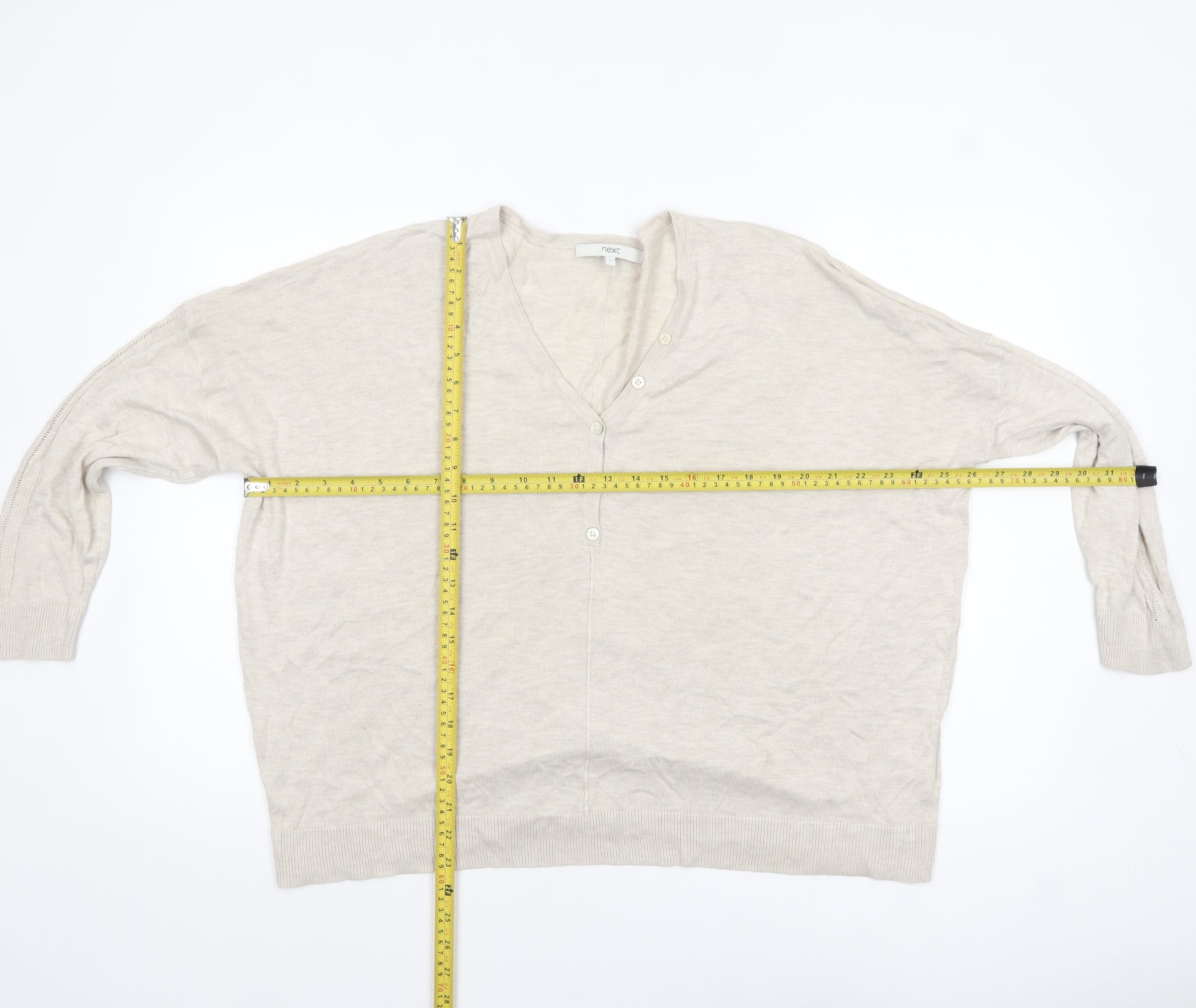 Refresh your knitwear collection with this stylish beige jumper from Next, designed for both comfort and effortless elegance. Crafted from a soft and breathable blend of viscose, nylon and modal, this lightweight piece offers a smooth drape and a cosy feel that's ideal for laid-back days or casual outings. The relaxed fit ensures easy movement, while the V-neck and subtle button detailing create a flattering silhouette that suits a wide range of styles and body types. The fine tight-knit construction adds to the jumper’s comfort, making it perfect for transitional seasons like spring and autumn. With its neutral beige hue, it pairs beautifully with denim, tailored trousers or skirts, offering endless wardrobe versatility. The 3/4 dolman sleeves add a touch of contemporary design, complemented by ribbed cuffs and hem for a gently fitted finish. Machine washable for easy care, this versatile jumper is a reliable addition to any wardrobe, blending Next’s reputable quality with timeless style. Whether you’re heading to work, meeting friends or lounging at home, this jumper provides understated sophistication and year-round wearability. In excellent pre-loved condition, it shows minimal signs of wear and has been carefully checked to ensure longevity. A fashionable essential for women who appreciate comfort and everyday elegance, this Next jumper combines modern simplicity with classic knitwear appeal—ready to keep you looking polished and feeling comfortable throughout the seasons.