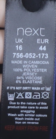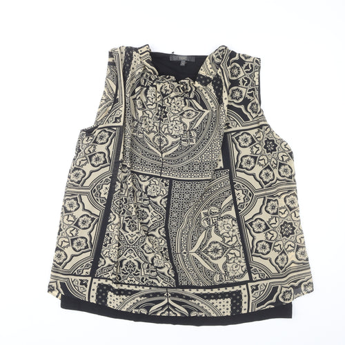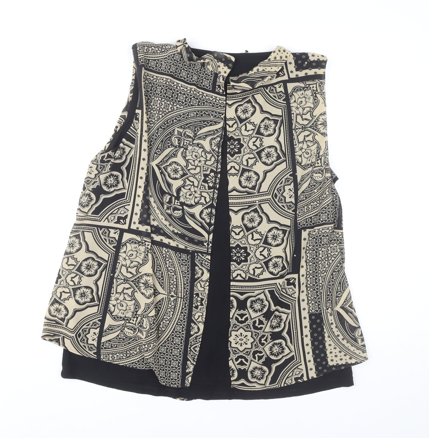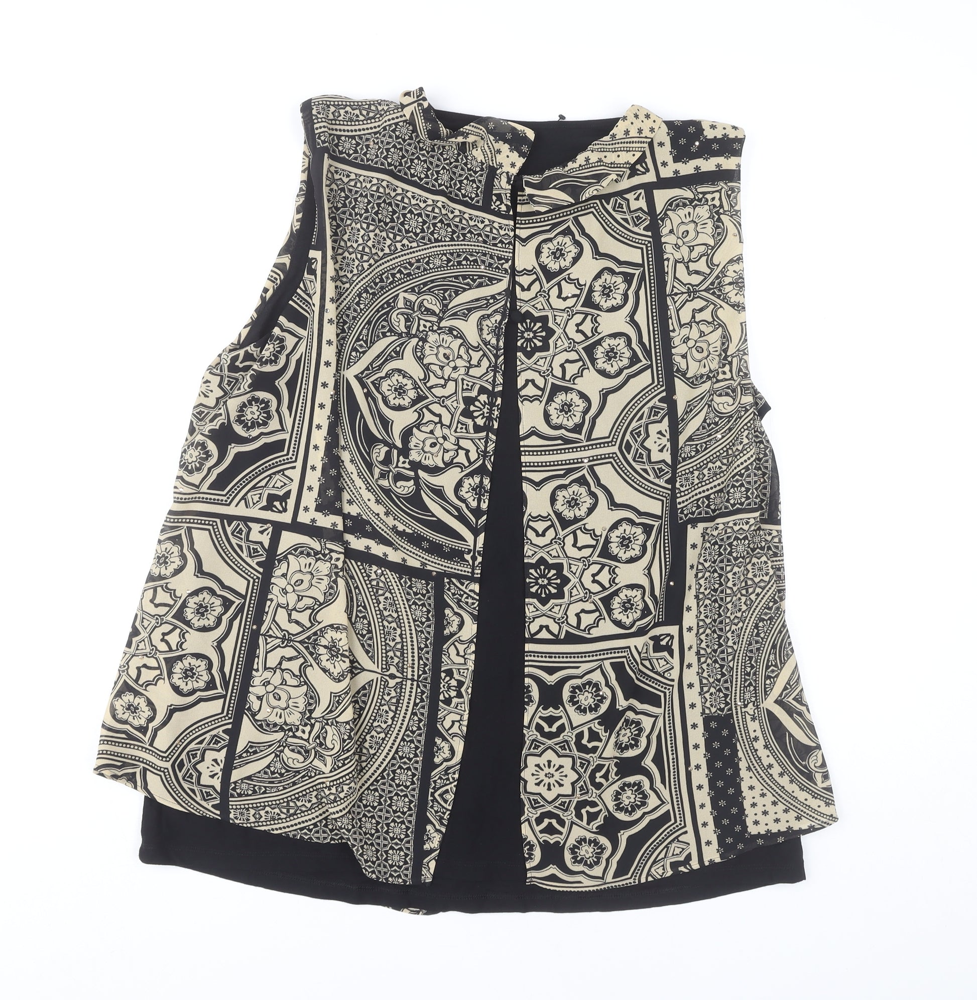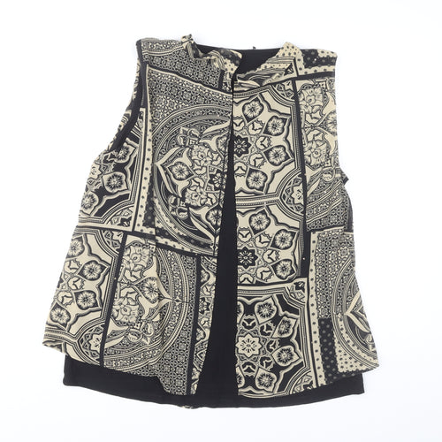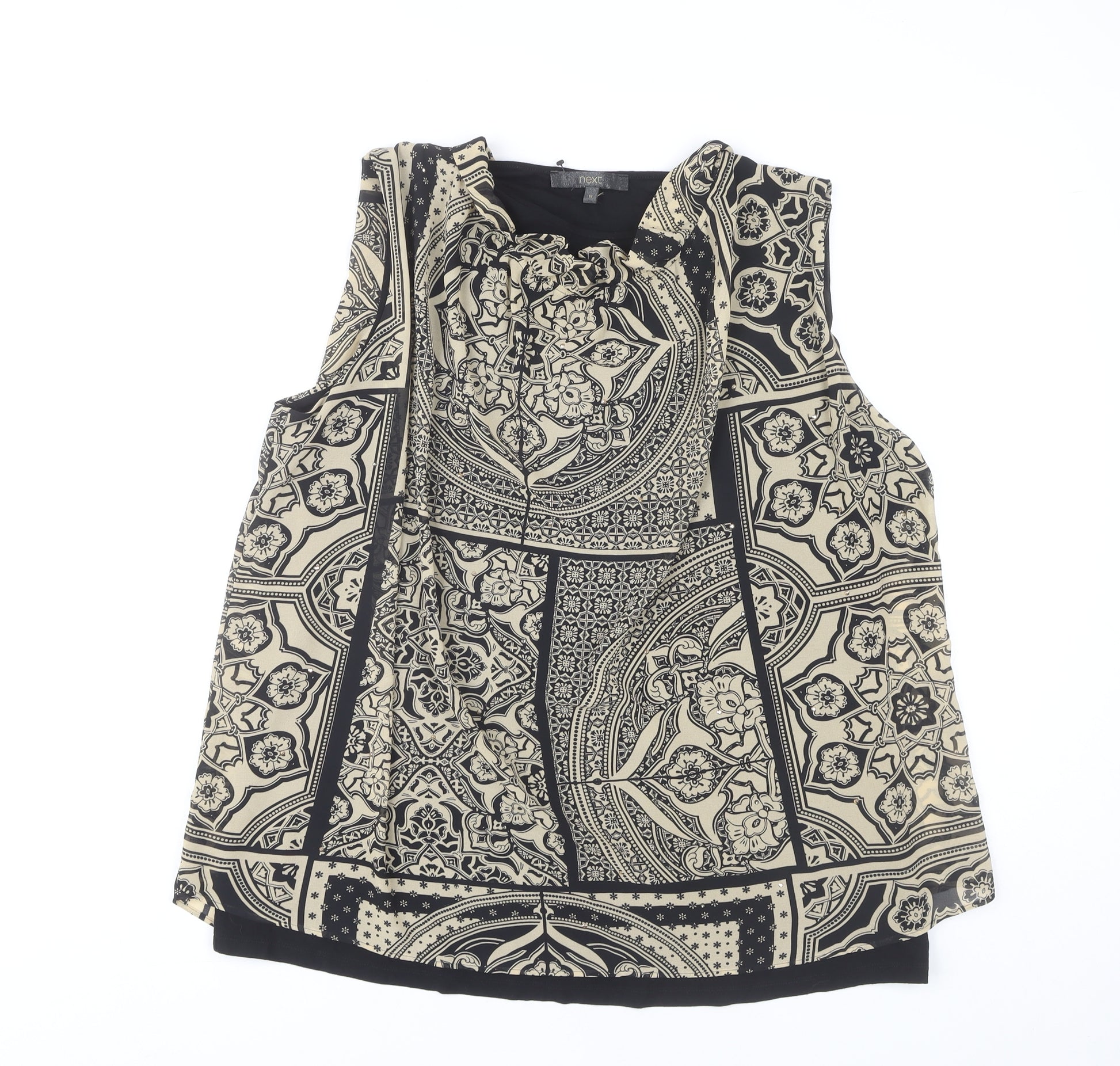 Elevate your wardrobe with this exquisite blouse from Next, a perfect blend of style and comfort. Designed for women, this sleeveless blouse comes in a chic combination of black and beige with an intricate geometric pattern, making it an excellent choice for casual outings or gatherings. Crafted from high-quality polyester, viscose, and elastane, the top offers a relaxed fit that drapes elegantly. The round neckline provides a classic touch, while the woven jersey fabric ensures a lightweight and breathable experience, ideal for all seasons. Although in excellent condition, there are no visible signs of wear or damage. This versatile piece is machine washable, allowing for easy care and maintenance. Whether you pair it with jeans for a casual look or dress it up with tailored trousers, this blouse will become a staple in your wardrobe. Secure this fashionable piece today and enjoy the comfort and style it offers.