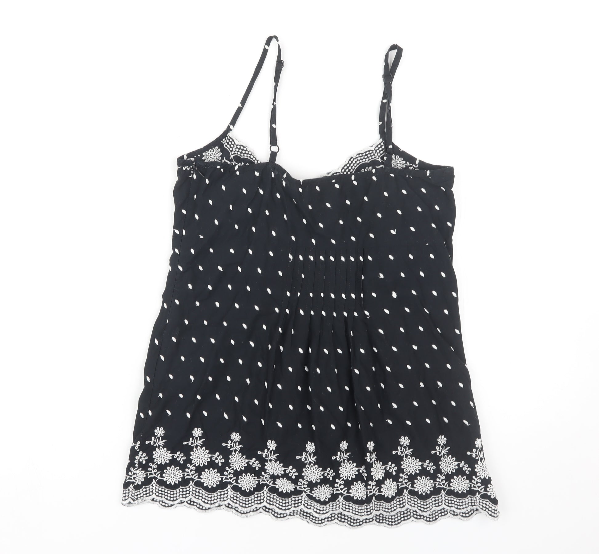 Step out in style with this stunning black camisole tank top from Next, perfect for adding a touch of elegance to your casual wardrobe. Designed for women, this sleeveless top showcases a delightful polka dot pattern and beautiful embroidered accents, making it a versatile choice for various occasions. Crafted from 100% cotton, it offers a comfortable and breathable fit, ideal for everyday wear. Featuring adjustable spaghetti straps, this stylish camisole ensures a perfect fit tailored to your comfort. With its scoop neck design, it effortlessly combines modern style with classic charm. Whether you're heading out for a casual day out or meeting friends, this top serves as a charming choice. Pair it with your favourite jeans or skirts to complete a chic and sophisticated look. Don't miss the chance to own this brand new piece with tags, guaranteeing superior quality and style. Grab yours today for a fabulous wardrobe update at an amazing price.