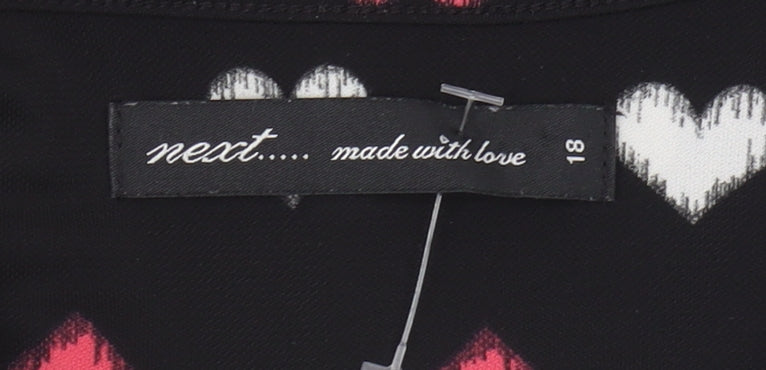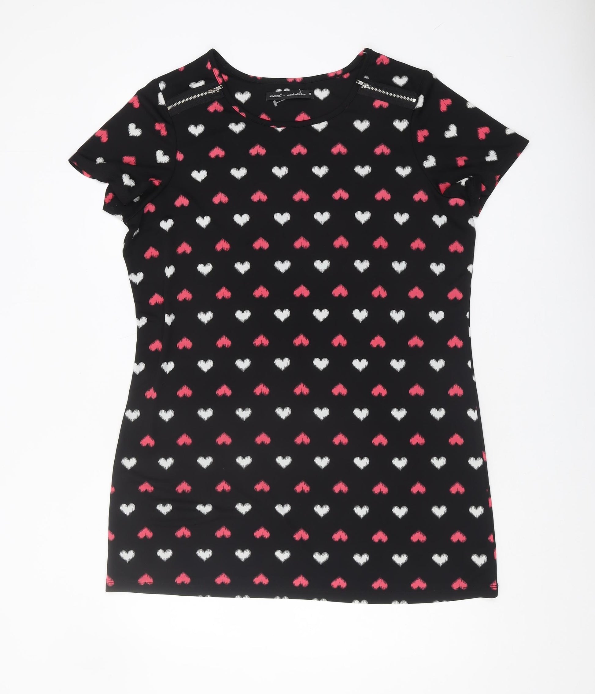 Embrace your fun and playful side with this delightful women's T-shirt from Next. Crafted entirely from durable polyester, this black T-shirt features a charming heart pattern in white and pink, bringing a touch of whimsy to any casual ensemble. The classic crew neckline and short sleeves ensure comfort and a relaxed fit, perfect for casual wear throughout the day. Accented with stylish zips at the shoulders, this top adds a subtle edge to its cute design. Ideal for the modern woman, this T-shirt fits a UK size 18, making it a versatile addition to your wardrobe for easy-to-style, everyday looks. Whether you're dressing it up with a sleek pair of jeans or keeping it simple with leggings, this T-shirt offers endless possibilities with its appealing print and comfortable fit. New with tags, seize the opportunity to add this unique piece to your collection and wear your heart on your sleeve with pride.