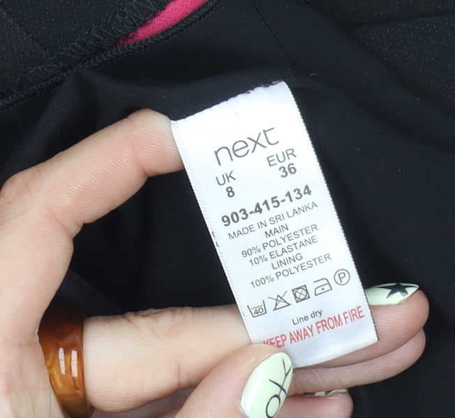 Step into elegance with this Next Women's Black and Pink Colourblock Bodycon Dress that's perfect for any summer cocktail party. Crafted from a luxurious jersey fabric, it offers a blend of 90% Polyester and 10% Elastane, ensuring a comfortable and form-fitting silhouette. The dress features a striking colourblock pattern in bold black and vibrant pink, enhancing your figure with its sleek, modern design. With a halter neckline and sleeveless cut, this dress provides a flattering shape while allowing the freedom to accessorize with your favourite jewellery. The concealed zip closure offers ease of wear, making it ideal for quick outfits changes. Its knee-length hemline is perfect for various events, from parties to evenings out, providing a balance of elegance and functionality. This dress maintains an excellent condition with no visible signs of wear, promising many more events for its next owner. A must-have for those who love bold style with a touch of sophistication.