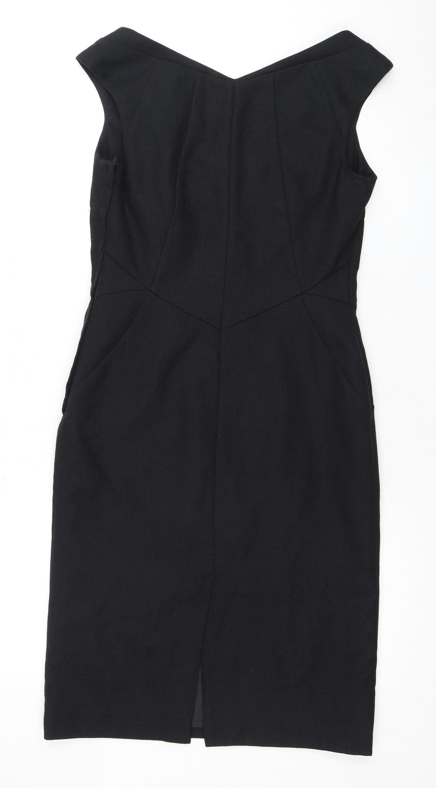 Elevate your wardrobe with this elegant black sheath dress by Next, perfect for any formal occasion or as stylish workwear. Crafted for the modern woman, this knee-length dress offers a sophisticated silhouette with its woven fabric composition, blending 78% polyester and 22% viscose for a comfortable fit. The V-neckline adds a touch of femininity, making it a versatile piece for both day and evening wear. Designed in a regular size 8, this dress is ideal for autumn and winter seasons, keeping you warm yet stylish. The zip closure ensures a seamless fit while the fully lined interior provides extra comfort against the skin. With no visible patterns, it's a classic that adheres to a formal or work setting beautifully. In excellent condition, the dress shows no signs of wear, assuring you of its quality and longevity. Machine washable for easy care, this sleek black dress is a must-have staple for any fashion-forward professional looking to make a subtle yet impactful statement. Don't miss the chance to make this elegant piece your own and elevate your style effortlessly.