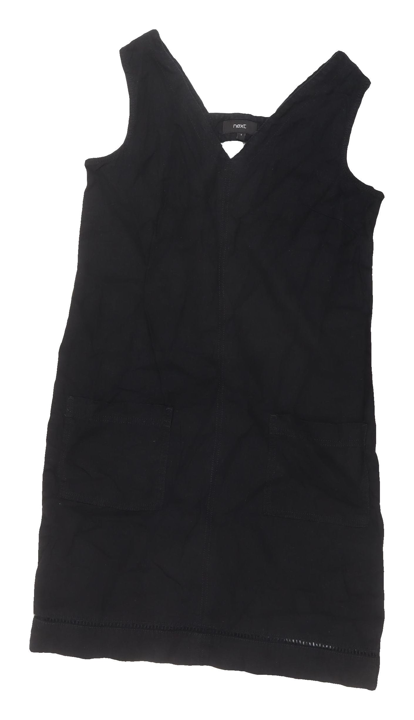 Elevate your wardrobe with this elegant black sleeveless shift dress from Next. Tailored to fit and flatter, this dress showcases a classic V-neckline that lends a touch of sophistication to any look. The sleeveless design offers versatility, making it perfect for layering or wearing alone for a minimalist chic style. Crafted from a luxurious blend of 55% linen and 45% viscose, this woven fabric ensures comfort and breathability, ideal for any occasion where style and ease are a must. Its simple and elegant shift style is timeless, offering a no-nonsense silhouette that pairs beautifully with both casual and more formal accessories. The black fabric offers a neutral base to experiment with vibrant accessories or keep it monochromatic with classic black heels or flats. The dress is machine washable, offering practicality for the modern woman on the go. In excellent condition with no visible defects, this piece is ready to make its mark in your collection. Whether heading to a business meeting or enjoying a casual outing, this dress provides the perfect blend of comfort and style. Don’t miss the opportunity to make this timeless piece a staple in your wardrobe today.