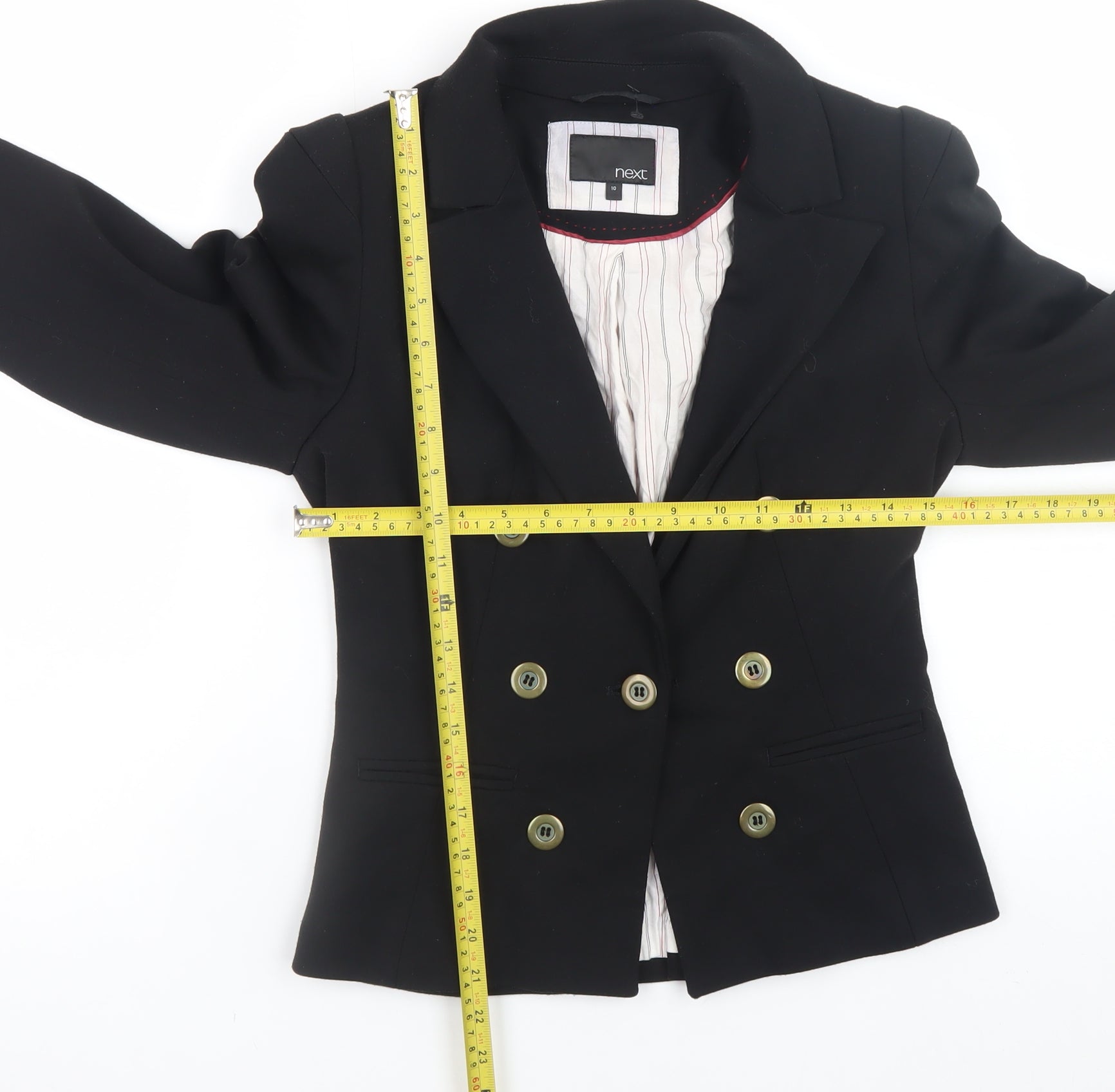 Step out in timeless sophistication with this elegant black blazer from Next, designed to flatter the female silhouette with its slim fit and tailored structure. Crafted from a blend of polyester, viscose, and elastane, it offers both comfort and flexibility for all-day wear. The sleek design is defined by its double-breasted button fastening and structured shoulders, making it a perfect choice for business meetings, formal events, or an effortlessly smart casual look. The interior features a soft 100% cotton body lining and a smooth polyester sleeve lining for added comfort and breathability. Styled with long sleeves and a refined collar, this blazer pairs beautifully with trousers or a pencil skirt for a complete office ensemble or can be dressed down with jeans for a chic weekend outfit. Its classic black colour and quality craftsmanship ensure it remains a wardrobe essential season after season. Ideal for autumn and spring, this piece embodies the perfect combination of smart and stylish. Conditioned in excellent pre-loved state with minimal wear noted, this item is ready for its next owner to enjoy. A versatile and professional addition to any woman’s wardrobe, the Next black blazer brings understated elegance to every occasion.