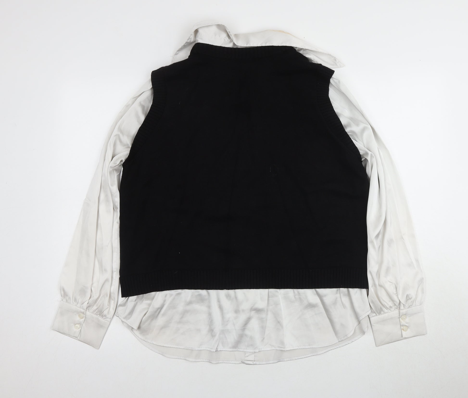 Discover elegance and comfort in this Next Women's Black Vest Jumper, perfect for a modern wardrobe update. Crafted from a blend of high-quality materials including cotton, nylon, polyester, wool, and elastane, this piece promises to offer durability and flexibility. Designed in a versatile black shade with a classic round neckline, it effortlessly elevates your casual or workwear outfits. The tight-knit structure adds to the overall high-end feel, ensuring you look impeccable with every wear. Despite being pre-loved, it remains in very good condition with only slight discolouration on the collar, adding character without compromising style. Buttons accentuate the design, adding a touch of sophistication. Suitable for various occasions, this jumper is machine washable, making it a practical, stylish choice for any fashion-forward individual.