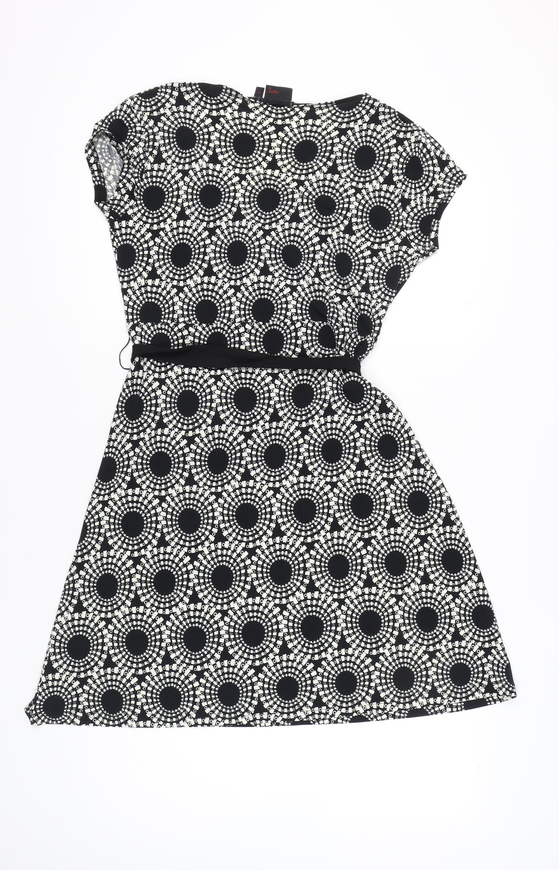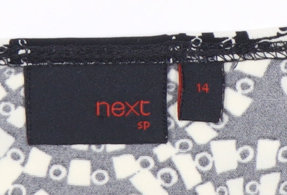 Elevate your everyday wardrobe with this chic Next women’s wrap dress in size 14, designed to flatter with its striking monochrome geometric pattern. Crafted from a soft jersey blend of 95% polyester and 5% elastane, this dress offers excellent stretch and comfort, allowing you to move with ease whether you are at work, socialising, or enjoying a casual day out. The short cap sleeves and V-neckline enhance the feminine silhouette, while the wrap front design, finished with a self-tie fabric belt, offers a flattering, adjustable fit that cinches at the waist. This knee-length dress ensures a versatile wear suitable for a wide range of occasions. Its contemporary geometric print in timeless black and white makes it a stylish yet classic choice, effortlessly pairing with heels for office or formal wear, or with sandals for a more relaxed vibe. The lightweight nature of the fabric also makes it an excellent option for spring, summer, and autumn wear, keeping you comfortable yet stylish through the seasons. An elegant essential, this dress embodies both sophistication and practicality. The machine-washable fabric ensures easy care, making it perfect for busy lifestyles, while the belt accent adds a touch of definition and polish. Whether you are looking for something to wear to work, a summer event, or even a smart casual evening out, this Next wrap dress is designed to make you feel confident and stylish. In excellent condition and lightly worn, this piece has been well-kept with no visible flaws, offering a fantastic opportunity to own a high-quality Next garment at a fraction of the original price. Add this versatile wardrobe staple to your collection today and enjoy effortless elegance whenever you wear it.