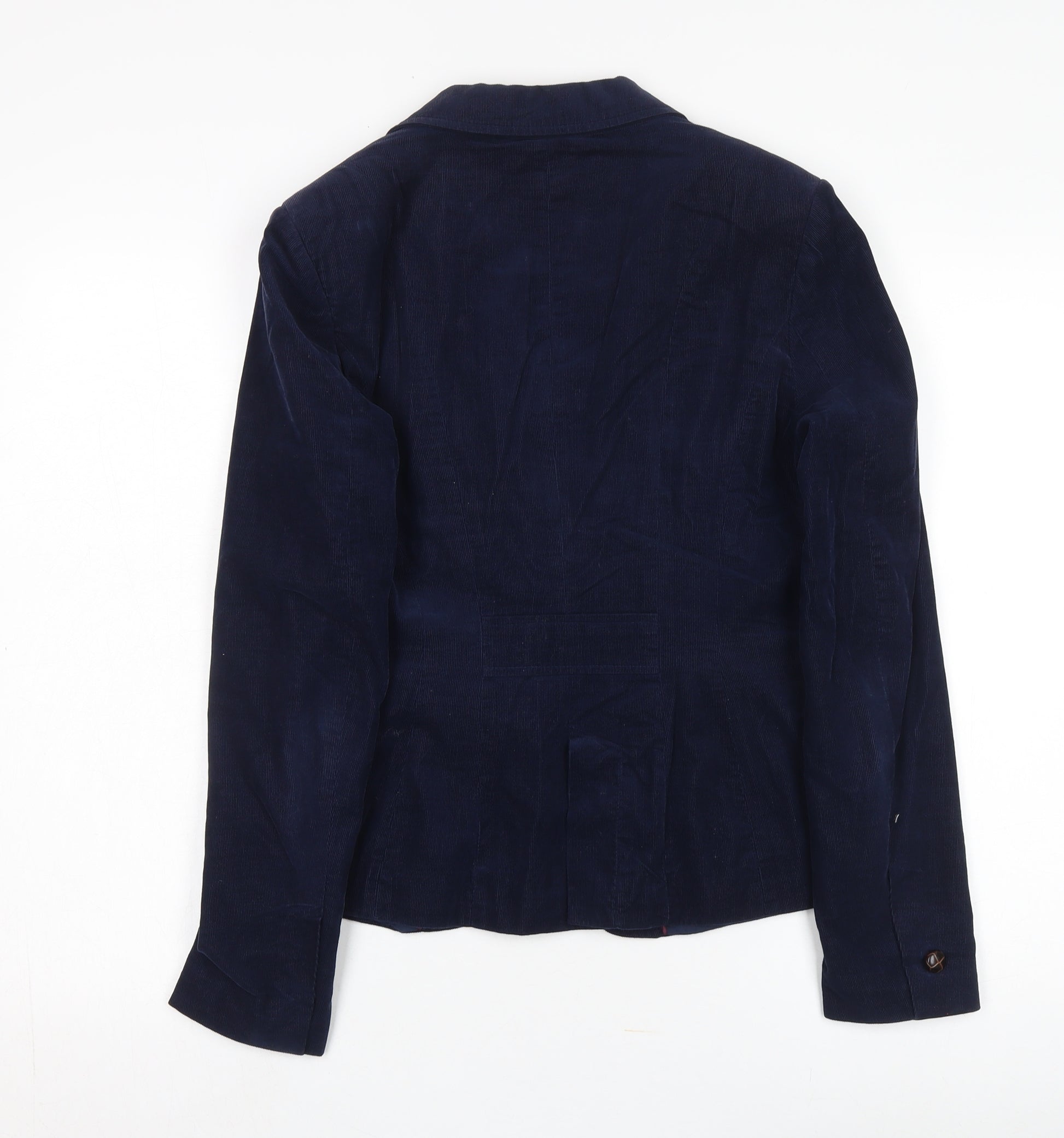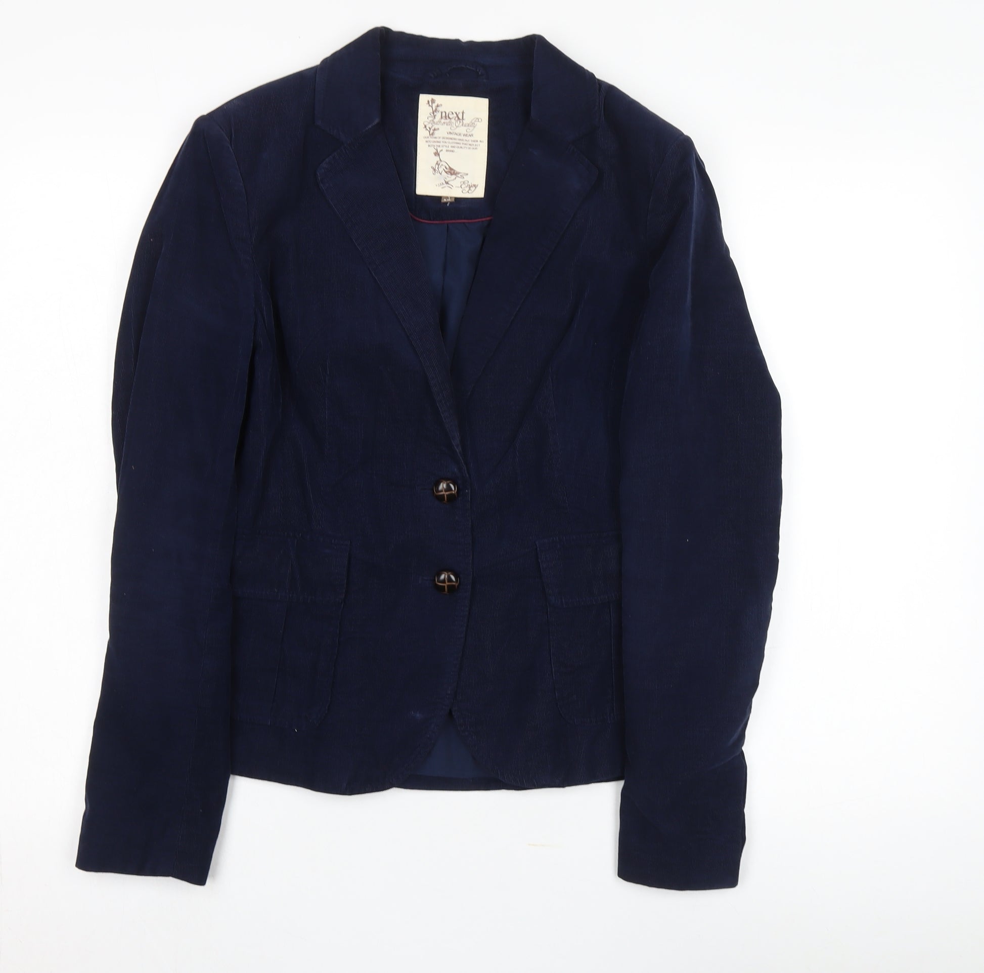 This classic women's blazer from Next is a stylish addition to any wardrobe. Made from 100% cotton corduroy, it combines comfort and durability with a chic, sophisticated look. The deep blue hue of the blazer adds a touch of elegance, making it suitable for both business and casual occasions. The blazer features a single-breasted design with button closures, offering a polished and professional appearance. It is fully lined with polyester for added comfort. The regular fit and size 12 ensure a flattering silhouette that is both modern and timeless. Ideal for the changing seasons of autumn and spring, this mid-length blazer provides a versatile layer that can be dressed up or down. Whether you're heading to the office or out for a casual outing, this blazer is sure to make a stylish statement. With no visible wear or damage, this item is in excellent condition, ready to enhance your wardrobe.