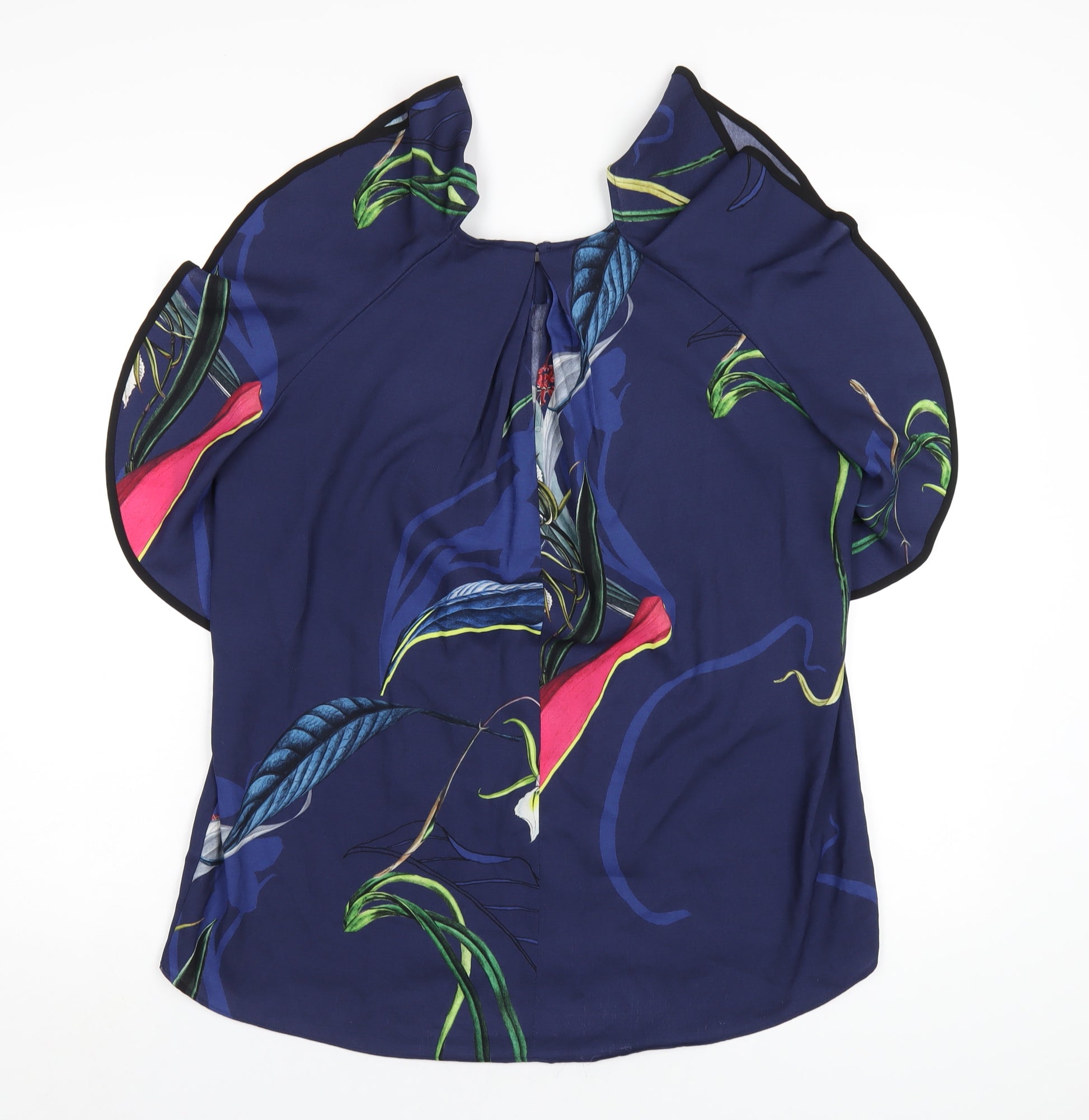 Womens Blue Floral Polyester Basic T-Shirt Size 12 Round Neck
