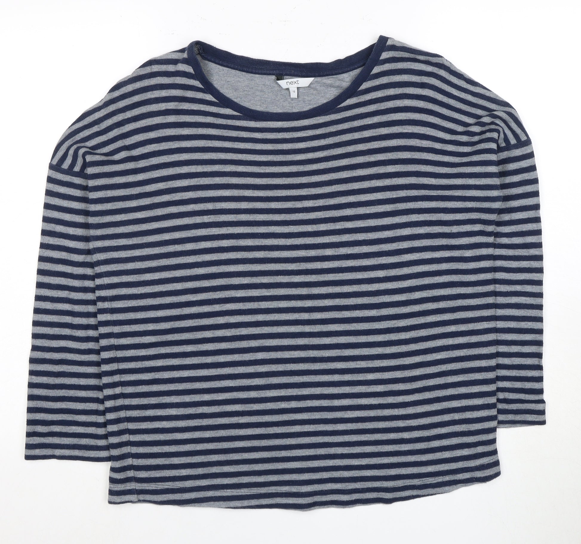 Elevate your casual wardrobe with this chic blue striped pullover jumper from Next. Perfectly designed for women, this jumper features a classic round neckline and comfortable 3/4 sleeves. Crafted primarily from soft cotton with a touch of nylon, it ensures breathability and comfort, making it an ideal choice for all-seasons wear. The tight-knit fabric provides durability while maintaining a lightweight feel, ideal for layering or wearing alone. The elegant blue striped pattern adds a timeless touch to your ensemble, allowing easy pairing with jeans or skirts for a versatile look. Suitable for a variety of casual occasions, this jumper will be a stylish addition to any wardrobe. With machine-washable care instructions, maintaining its excellent condition is effortless. An alluring blend of comfort and style, this Next pullover jumper is a must-have piece for fashion-forward individuals.
