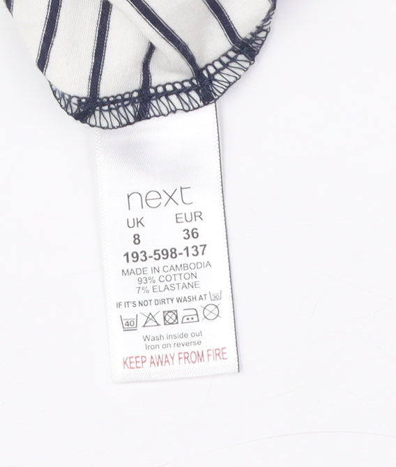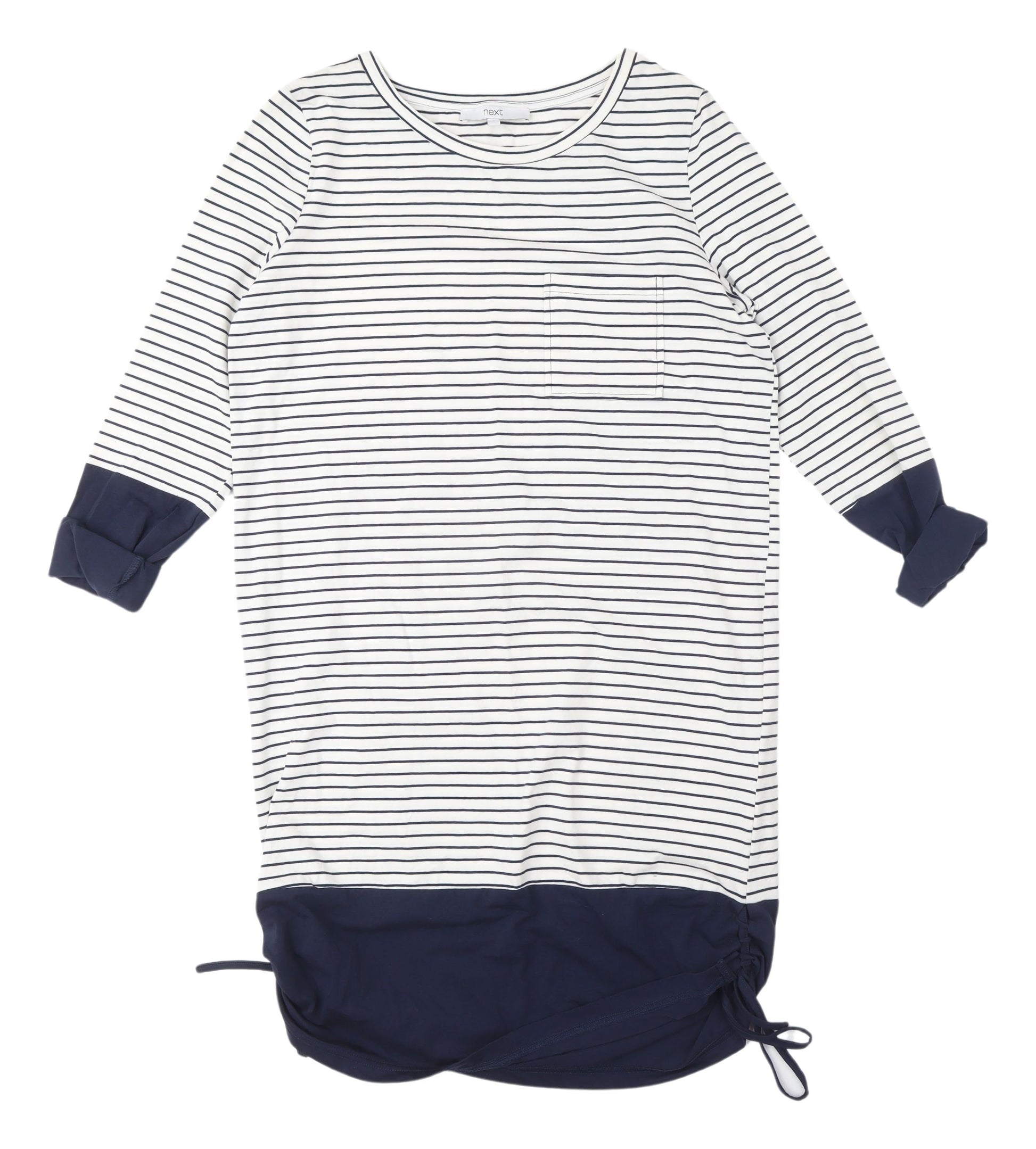 Discover everyday ease with this Next Women's Blue Striped T-Shirt Dress. Designed for casual comfort, this dress embodies a classic style with its navy and white stripe pattern, offering a timeless appeal. The T-shirt dress silhouette, combined with 3/4 length raglan sleeves, ensures a relaxed and comfortable fit for any casual outing. Crafted from a blend of 93% cotton and 7% elastane, the jersey fabric provides a soft and stretchy feel. This dress is perfect for spring and summer seasons, allowing breathability and ease of movement. The crew neck and pullover design add simplicity and elegance, while the adjustable drawstring accent allows you to customize the fit to your preference. Although previously enjoyed, this dress is in excellent condition with only slight signs of wear, ready to be a staple in your wardrobe. Machine washable for easy care, it's ideal for those who value both style and practicality. Whether you're heading out for a coffee or a casual day in the park, this dress offers versatility and simplicity for the modern woman.