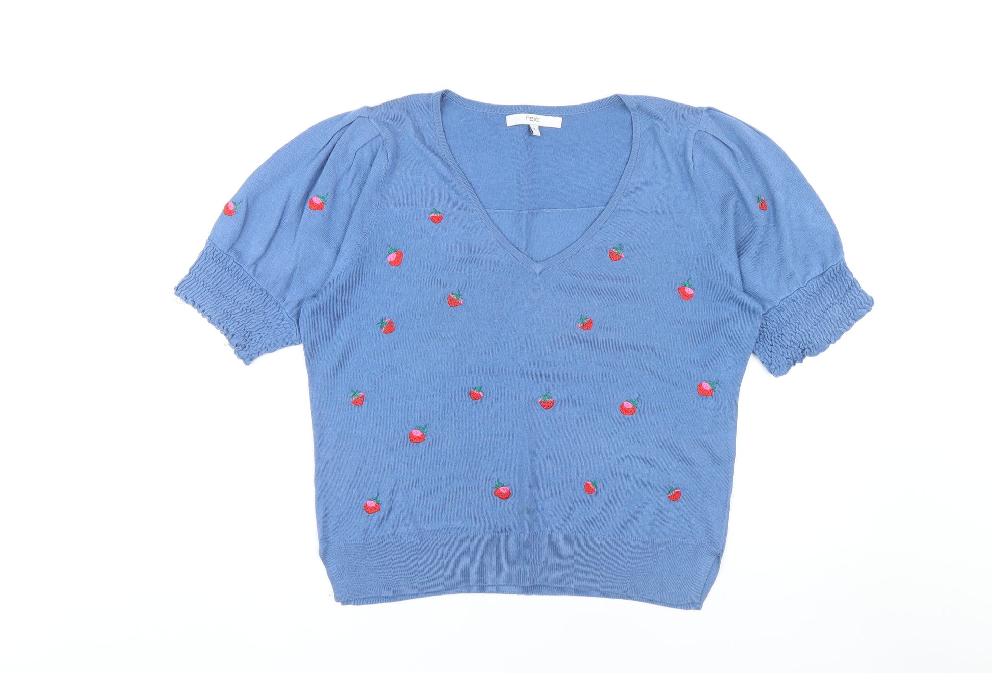 Enhance your wardrobe with this delightful Next Women's Blue V-Neck Pullover Jumper, perfect for adding a touch of charm to your casual collection. This jumper features a classic V-neckline that beautifully complements its blue hue, making it a versatile piece for various occasions. Designed for a regular fit, this pullover ensures comfort with its soft knit fabric, while the short puff sleeves add a stylish flair. Accented with charming embroidered details, it becomes a playful addition to your seasonal outfits, embodying a unique touch without overwhelming your look.Crafted from a blend of polyester and viscose, this jumper offers excellent durability and a soft feel against the skin, making it suitable for all-day wear during the mild spring months. Its easy-care feature allows for simple maintenance with machine washability, making it a practical choice for everyday use.Whether you're headed to a casual brunch or a relaxed day out, this jumper provides effortless style and comfort. Pair it with your favourite jeans or a skirt for a quick and chic ensemble that's perfect for any spring outing. Despite its lack of visible wear or tear, indicating it's in excellent condition, it doesn't come with original sales tags, ensuring you a quality purchase at a reasonable price. Update your wardrobe now with this fantastic piece from Next, designed for the modern woman who values both style and comfort.