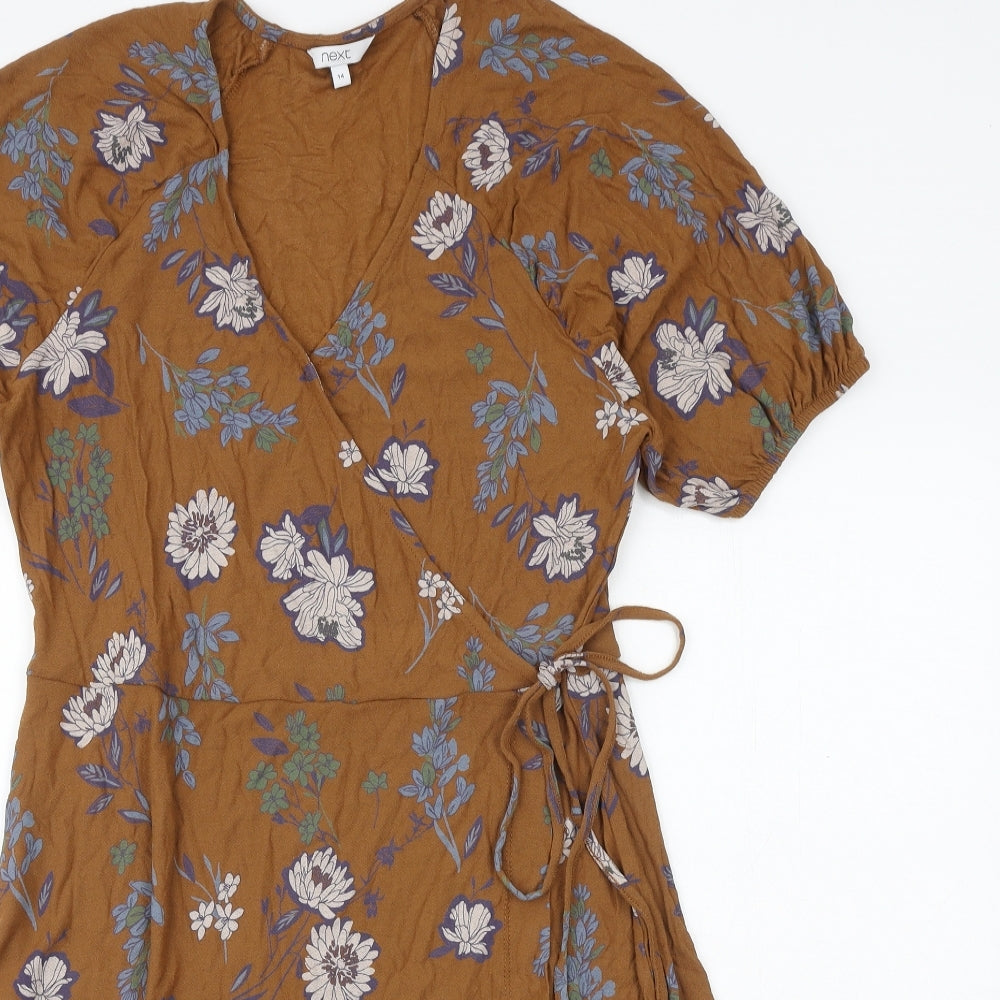 Womens Brown Floral Viscose Wrap Dress Size 14 V-Neck Tie