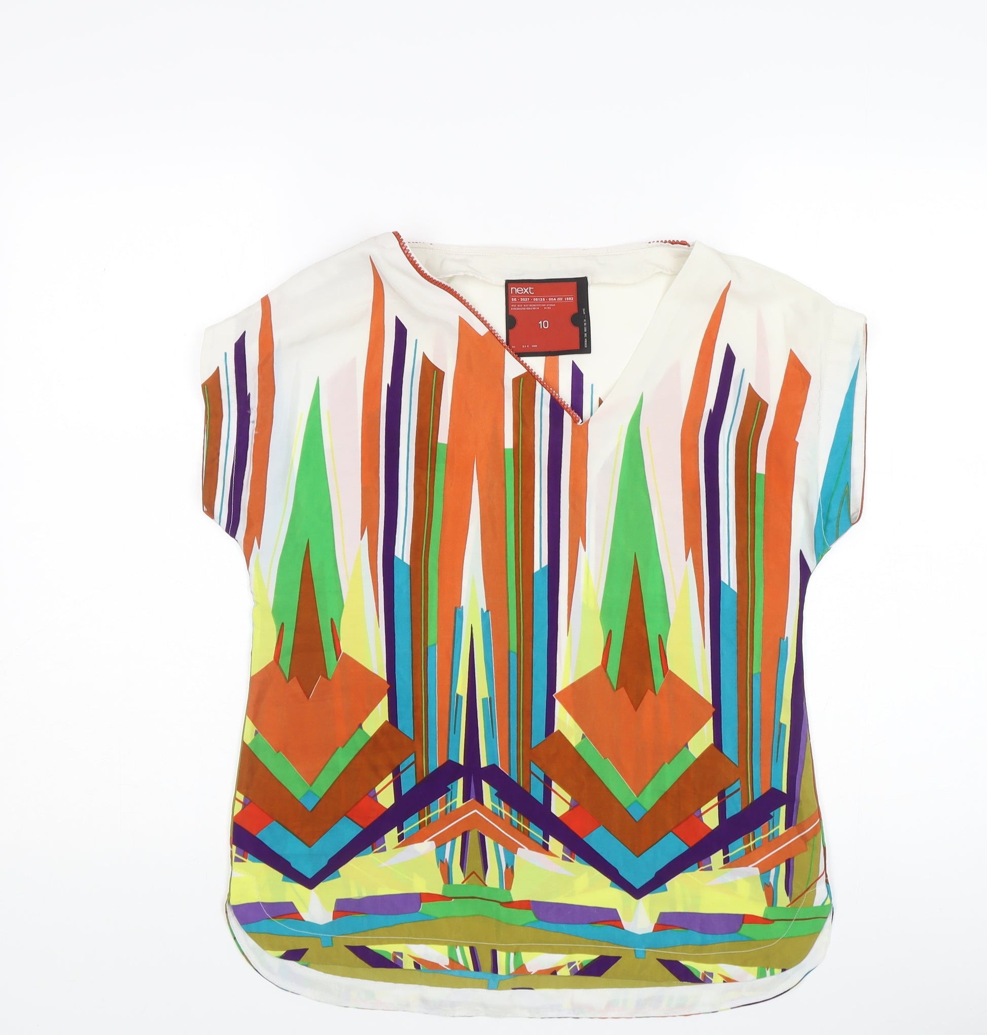 Elevate your wardrobe with this vibrant Women's Geometric Multicoloured Blouse from Next. Designed for the fashion-forward woman, this blouse features a striking geometric pattern in a multitude of colours, making it a standout piece for any casual occasion. The blouse is crafted from 100% polyester, ensuring a comfortable and lightweight fit that is perfect for everyday wear. Featuring a flattering V-neckline and cap sleeves, this blouse offers a sleek silhouette with a regular fit that beautifully drapes your body. The bold colours and unique design make it easy to pair with your favourite jeans or skirts, allowing you to express your style effortlessly. Ideal for casual settings, this blouse is machine washable, providing easy maintenance and hassle-free cleaning. Despite being preloved, this piece is in excellent condition with no visible wear or damage, assuring you of its quality and durability. Priced at £15.25, this blouse is a chic addition to any woman's collection, offering a blend of style and comfort that you'll love to wear time and again. Don't miss the chance to add a touch of colour and modern style to your wardrobe with this stunning geometric blouse.
