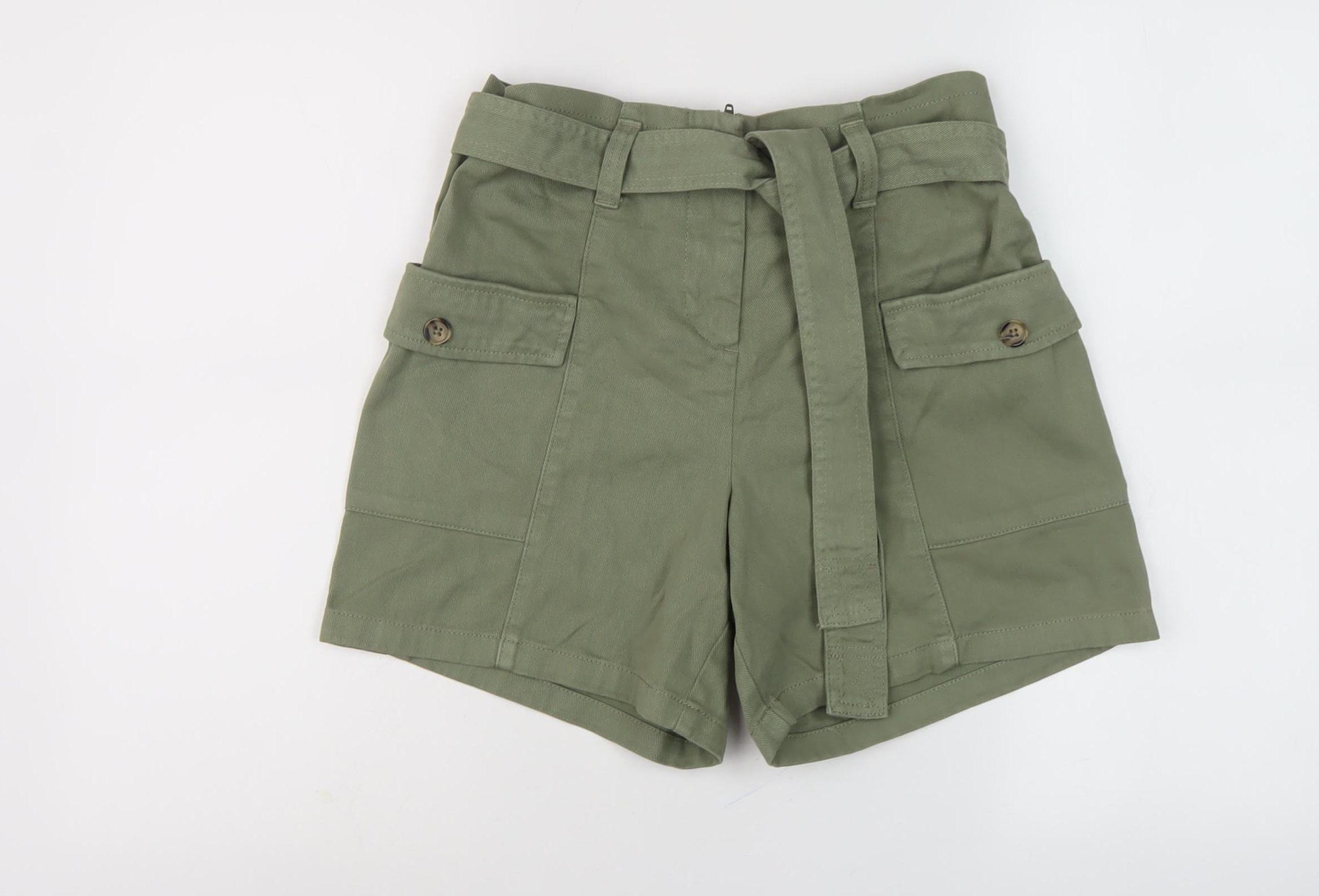 Discover a chic addition to your wardrobe with these stylish high-rise utility shorts by Next, perfect for the modern woman. Designed in a refreshing green hue, these shorts offer a combination of fashion and functionality. Crafted from 100% cotton, they ensure comfort and breathability, making them ideal for casual outings during spring and summer. Featuring a belted design with buckle and button accents, these shorts provide a flattering fit and a touch of military-inspired style. The convenient cargo pockets add practicality while maintaining a sleek look. Easy to care for, simply machine washable, these shorts are a versatile staple for any fashion-forward individual. Pair them with a casual tee or blouse for a relaxed yet stylish ensemble. Don't miss out on this must-have piece that effortlessly blends style and comfort.