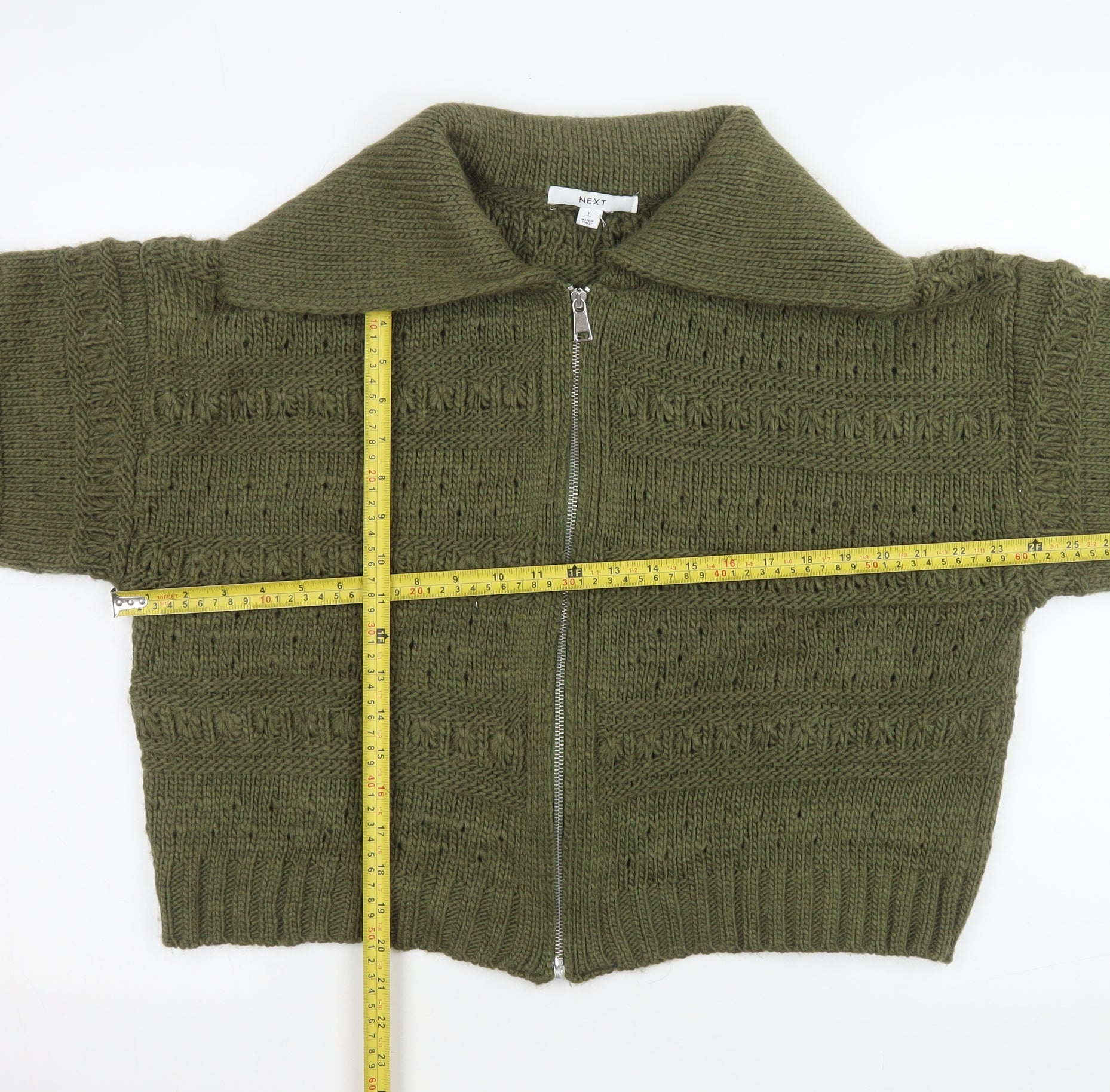 Step into timeless comfort and style with this beautiful green knitted jacket from NEXT, crafted for women who value both cosiness and effortless chic. Designed in a versatile cropped style, it offers a modern silhouette perfect for layering over tops, dresses, or high-waisted jeans. Fashioned from soft 100% acrylic knit, it feels plush yet lightweight, ensuring you stay warm without bulk. The relaxed fit delivers ease of movement while the full zip front and ribbed cuffs add a practical, casual appeal. A broad collar frames the neckline, lending a contemporary twist to its classic charm. Finished in a seasonal green hue, this piece transitions flawlessly from autumn strolls to cosy winter gatherings. Ideal for casual outings or laid-back weekends, it balances everyday wearability with understated sophistication. In very good pre-owned condition, showing minimal signs of gentle wear, it maintains both quality and appeal. Pair it with denim or corduroy for a timeless look that’s comfortable, fashionable, and uniquely NEXT. With its breathable knit construction and versatile styling, this cropped zip-up jacket is destined to become a reliable wardrobe favourite for seasons to come.