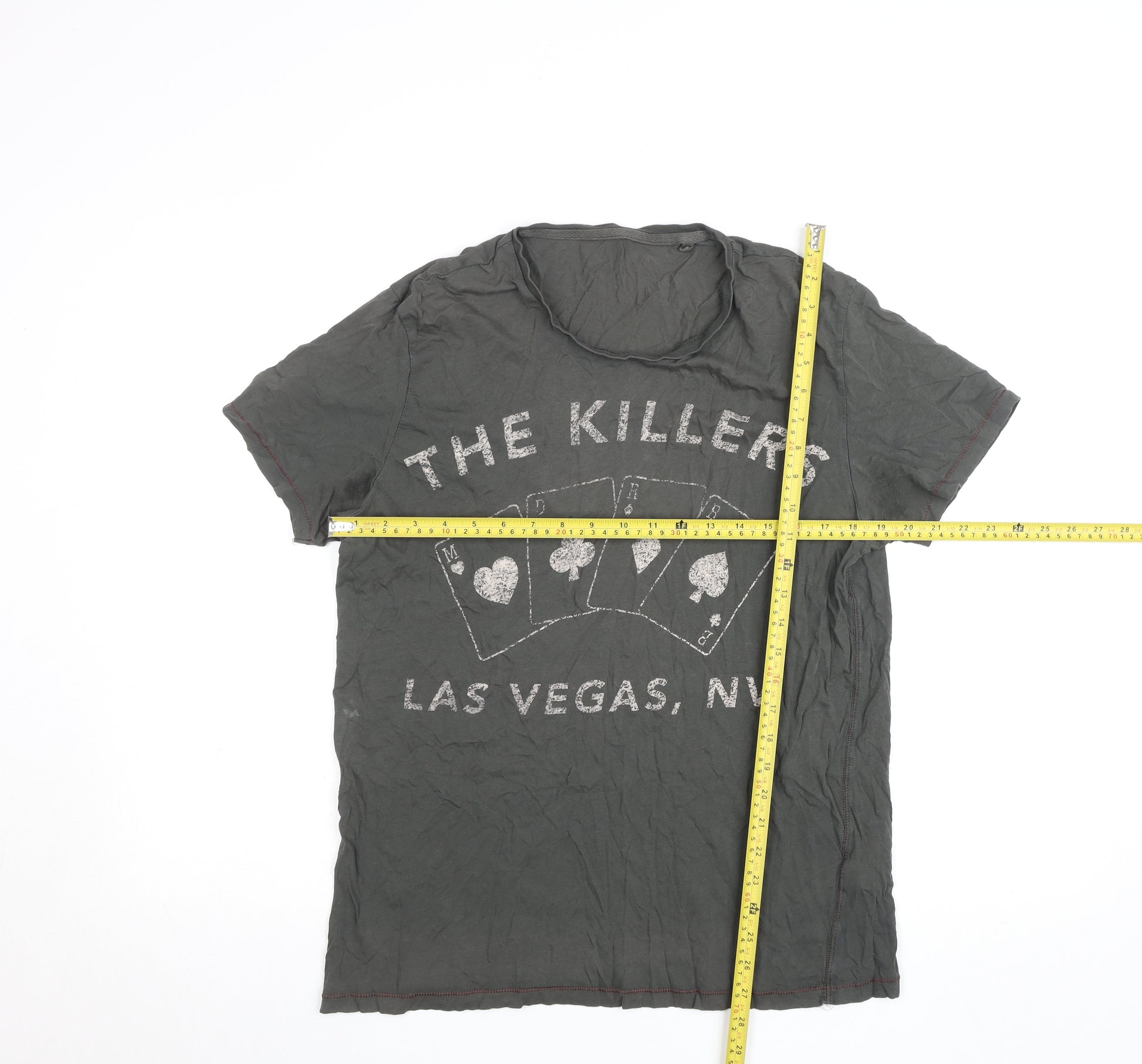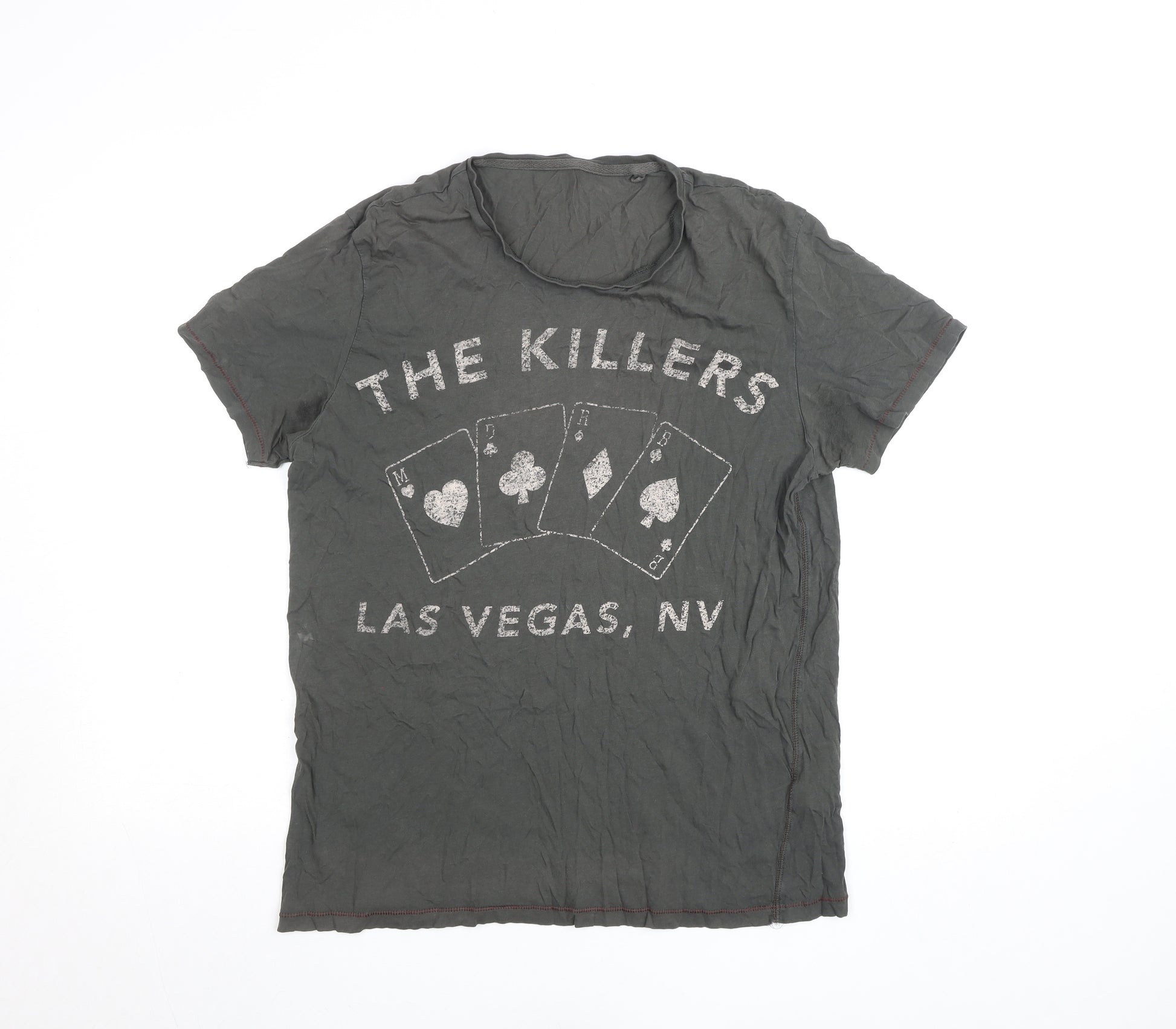 Express your laid-back, music-loving style with this Next women's grey short sleeve T-shirt. Crafted from soft, breathable 100% cotton jersey, this piece offers comfort and effortless casual appeal. The shirt features a classic crew neckline and fitted short sleeves, making it perfect for everyday wear. Its eye-catching print design draws inspiration from iconic Las Vegas themes and music culture, giving it that authentic, edgy vibe that pairs beautifully with jeans, skirts, or shorts. The soft grey tone and subtle worn-in look make it an easy match for a wide range of outfits, adding a touch of understated coolness to your wardrobe. Designed in a comfortable regular fit, it’s ideal for relaxed days, weekend outings, or laid-back social gatherings. Lightweight and breathable, it’s suitable for warmer seasons like spring and summer, though it also layers well under jackets for autumn styling. The T-shirt is machine washable for easy care, making it convenient for everyday wear. In very good pre-owned condition, it shows only minimal signs of wear with light creasing consistent with gentle use. A fantastic choice for lovers of casual fashion and music-themed apparel, this cotton T-shirt delivers both comfort and character. Whether you’re heading out to a concert, meeting friends, or just relaxing at home, this versatile grey top will effortlessly complement your style. Pick up this Next women’s T-shirt for a cool, relaxed addition to your wardrobe that captures both personality and comfort.