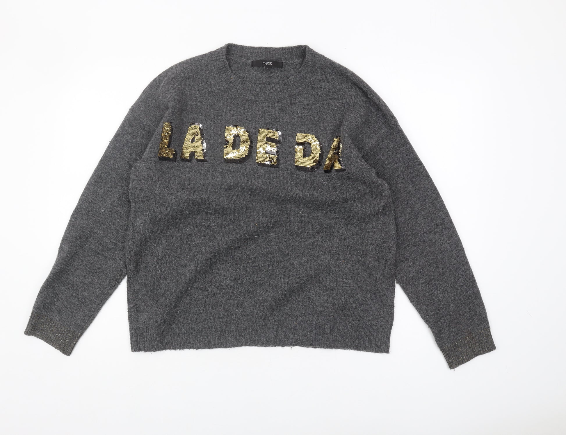 Embrace a touch of sparkle with this classic women's grey pullover jumper from Next. Perfect for adding a hint of glamour to your everyday wear, this jumper is crafted with a blend of polyester, acrylic, nylon, and elastane, ensuring both comfort and durability. The relaxed fit, complete with a crew neckline, makes it easy to layer over your favourite shirts or wear on its own for a chic and effortless look.Featuring a sequin graphic print, this jumper stands out with its 'LA DE DA' motif, bringing a fun, playful vibe to your outfit. Its chunky-knit style adds warmth, making it an ideal choice for the cooler autumn and winter months. With machine washable care instructions, upkeep is easy, allowing you more time to enjoy this stylish piece.Whether you're dressing up for a casual outing or simply looking to add an eye-catching element to your winter wardrobe, this jumper ensures you do so in style. Its vibrant design elements combined with a classic grey tone create a versatile piece that seamlessly blends with other wardrobe staples.In very good condition, it shows minor wear but no visible damage, making it a wonderful addition to any fashion-forward wardrobe at an attractive price point.