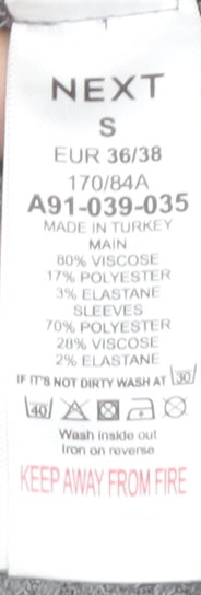 This charming grey pullover jumper from Next is designed for the modern woman who appreciates style and comfort. Crafted from high-quality materials, the blend of viscose, polyester, and elastane ensures a soft and snug fit, perfect for the cooler months of autumn and winter. The jumper features a chic mock neck that adds a touch of sophistication, transitioning seamlessly from casual daytime errands to cozy evening gatherings. Its long sleeves are striped, adding a playful contrast to the solid grey body. With a size Small, this regular fit jumper flatters a variety of shapes, ensuring both comfort and style. Machine washable for easy care, this knit is versatile enough for casual occasions or simply relaxing at home. Whether paired with jeans or layered over a simple top, it's an essential addition to any wardrobe. Excellent used condition guarantees it has been well-maintained, ready to become a staple piece in your collection. Don't miss out on this stylish find—perfect for keeping warm and in vogue throughout the season.