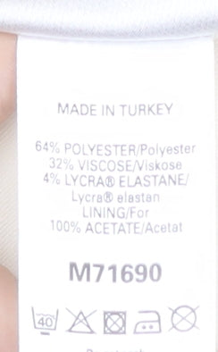 Discover the elegant comfort of these women's ivory trousers from Next. Designed in a UK size 10, these trousers offer a flattering flared leg style that adds a touch of sophistication to any outfit. The trousers are made from a high-quality blend of materials including 64% polyester, 32% viscose, and 4% elastane, ensuring durability, flexibility, and a comfortable fit. The stylish belted feature with a buckle closure not only adds elegance but also enhances the overall fit and silhouette. These trousers are perfect for various occasions, whether you're dressing up for a formal event or adding a chic touch to a casual look. Their mid-rise and regular fit offer the perfect balance of comfort and style. The plain ivory colour provides a classic and versatile base, ideal for pairing with different tops and accessories. Despite being in excellent condition, a slight discolouration is present, adding unique character. Machine washable for easy care, these trousers are a staple addition to any wardrobe, offering both style and practicality. Grab these sophisticated Next trousers and elevate your fashion game effortlessly.