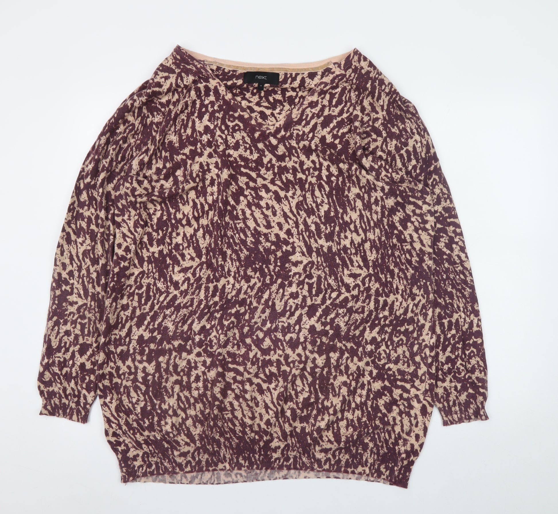 Add effortless sophistication to your wardrobe with this chic women’s jumper from Next. Crafted from a soft cotton blend with added nylon and viscose for comfort and durability, this versatile pullover is perfect for cooler days and year-round layering. The eye-catching multicoloured pattern features a classic animal print in beige and deep plum tones, creating a modern twist on a timeless motif. Designed in a flattering regular fit, the jumper features a boat neckline, long sleeves, and a ribbed hem and cuffs to provide structure and a comfortable fit. The lightweight knit offers a smooth and breathable feel, making it ideal for wearing on its own during transitional seasons or layered over a collared shirt for a smart-casual look. This piece pairs beautifully with jeans, tailored trousers, or skirts, making it an excellent choice for everyday wear, casual outings, or relaxed office days. The quality craftsmanship that Next is known for ensures both style and longevity, while the machine washable material makes it practical and easy to care for. In excellent pre-owned condition with no visible defects, this jumper offers both value and style for your wardrobe. Ideal for autumn and winter, it provides warmth without bulk and a stylish edge that effortlessly elevates any outfit. Whether you’re heading out for coffee, running errands, or meeting friends after work, this printed jumper is sure to become a wardrobe favourite for seasons to come. Bring texture and personality to your cold-weather collection with this beautiful, comfortable piece from Next.