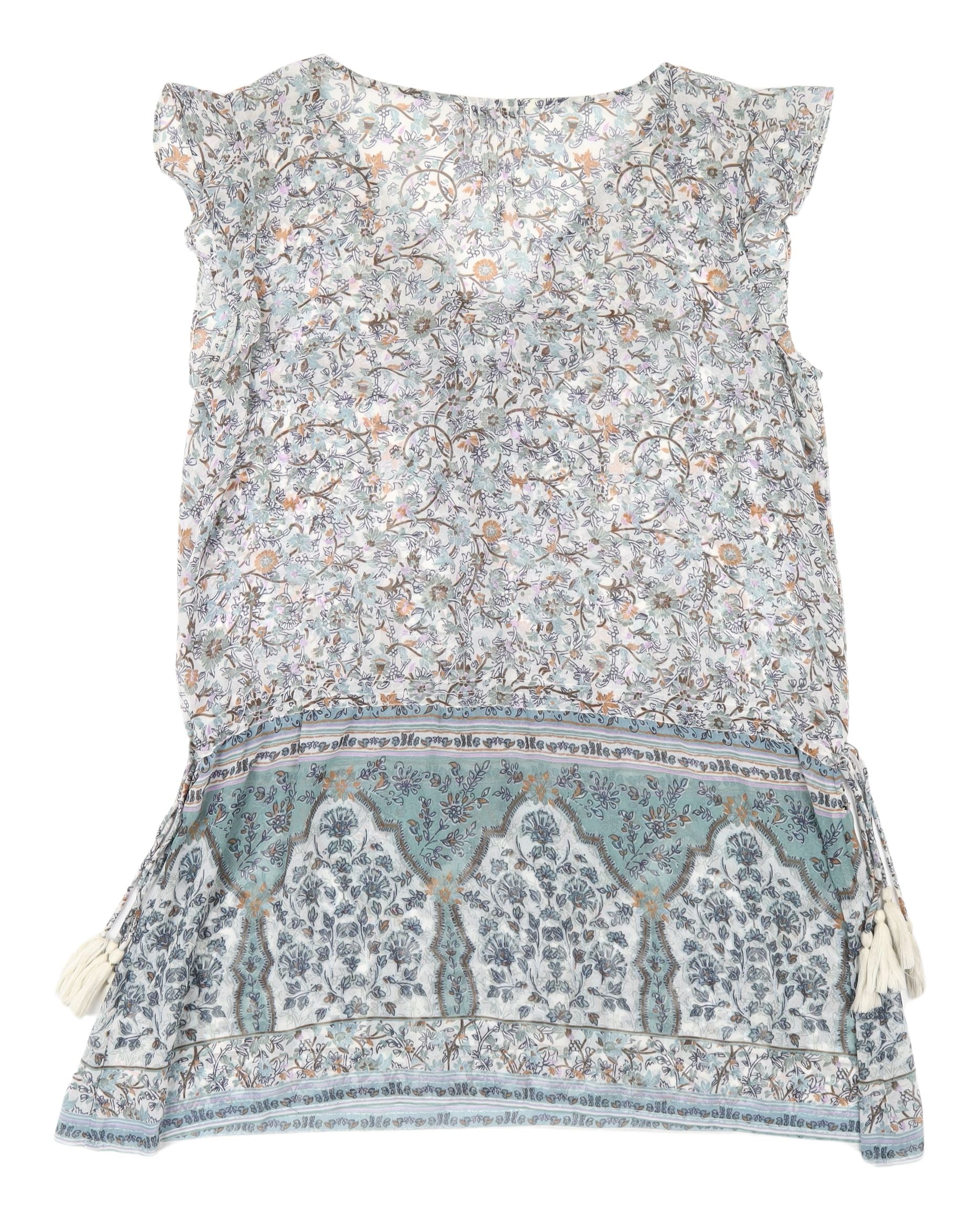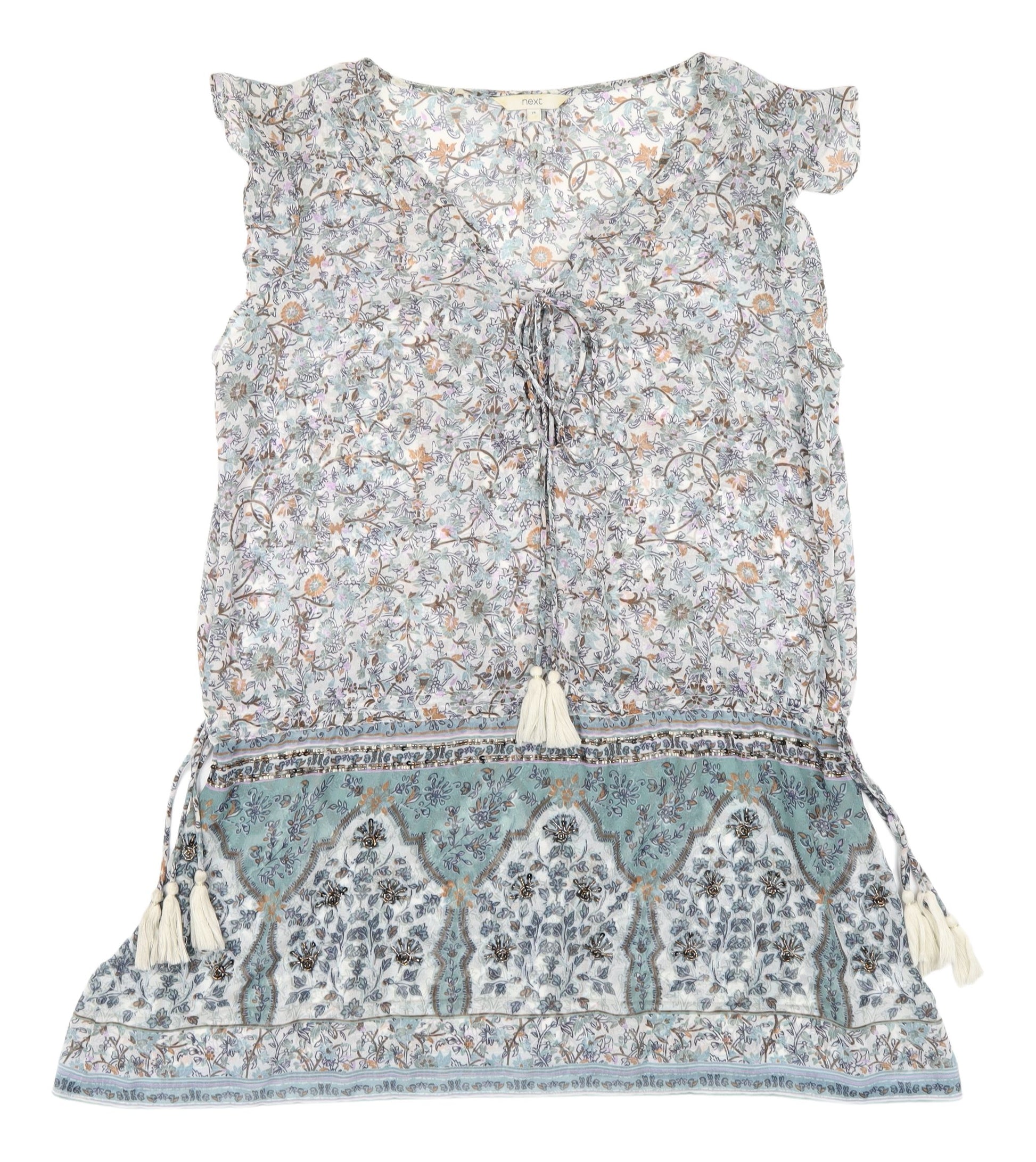 This casual kaftan dress by Next is an ideal choice for spring and summer outings. Featuring a charming floral pattern in a blend of soothing hues, it evokes a laid-back Bohemian vibe that is both stylish and comfortable. Crafted from 100% polyester, the fabric is woven for a lightweight feel, making it perfect for warm-weather wear. The sleeveless design is accentuated by delicate flutter sleeves, adding a touch of femininity to the dress. It showcases a round neckline and a tie closure, which enhances its relaxed fit. The tasselled accents introduce an element of whimsy, while the overall lightweight nature ensures breathability, promoting comfort during extended wear. Machine washable, this dress offers convenience without sacrificing style, making it a practical addition to any wardrobe. Ideal for casual occasions, it pairs well with simple accessories for a complete, effortless look. Perfect for the woman who appreciates both style and comfort, this dress is an excellent choice for a casual day out or a relaxed gathering.