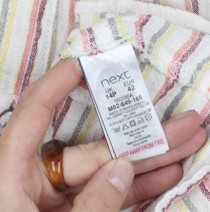 Discover effortless style with this chic women's pinafore dress from Next. Perfect for spring and summer, this multicoloured dress with its stylish striped pattern is the ideal addition to your casual wardrobe. Made from a luxurious blend of linen and viscose, the fabric offers a breathable, lightweight feel that is perfect for warmer days.Designed in a flattering V-neck cut, this midi dress features a striking button accent that not only adds a touch of detail but also makes it easy to slip on and off. Its sleeveless design, complete with strappy sleeves, enhances its versatility, allowing you to style it over a simple tee for a laid-back look or on its own for carefree summer vibes.The bohemian theme is highlighted through its relaxed fit and earthy tones, making it a great choice for everyday wear or casual outings. This dress is machine washable for easy care, ensuring it will remain a trusty piece in your wardrobe for years to come.Despite being pre-loved, this dress is in excellent condition with no visible flaws. Available in size 14 with a petites fit, it offers a comfortable yet stylish option for those seeking a bohemian touch in their wardrobe. Ready to layer and style, this dress is your go-to for making fashion simple yet impactful. Don't miss out on this timeless piece, perfect for expressing your unique style.