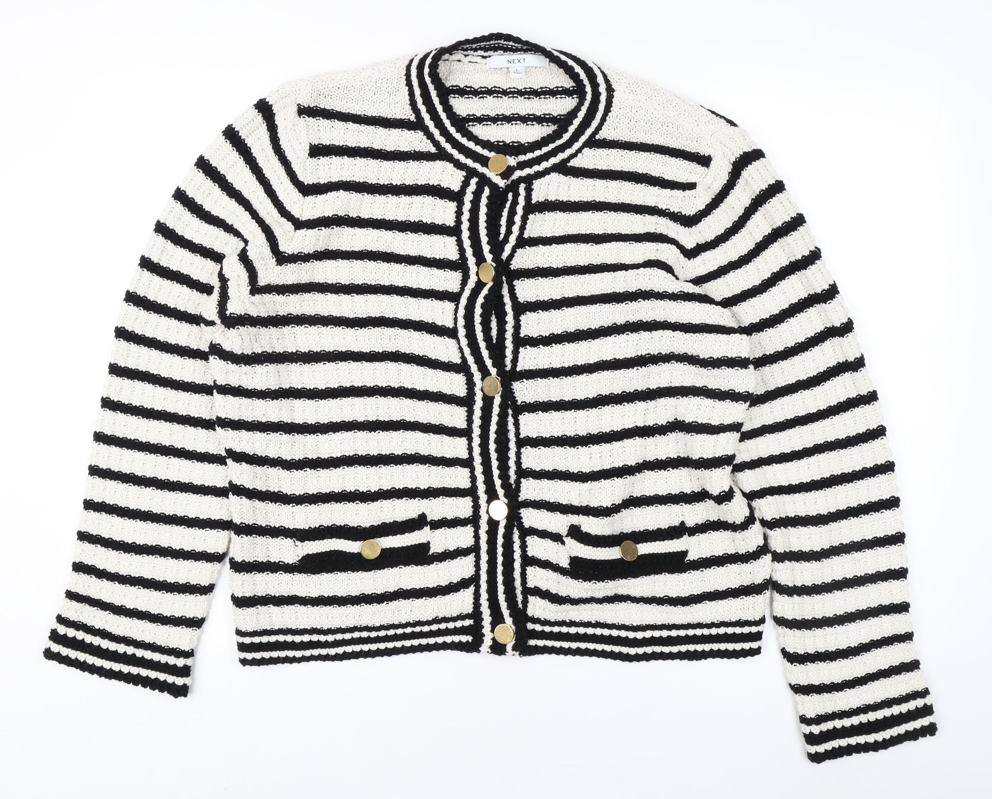Add a stylish touch to your wardrobe with this chic Next Women's Multicoloured Striped Cardigan. Perfectly combining classic and contemporary styles, this cardigan is a versatile addition to any outfit. Crafted in a soft blend of acrylic and cotton, it's comfortable to wear throughout the year, offering a cosy feel while ensuring breathability.Featuring a round neckline and long sleeves, the cardigan highlights a button-up design, adding a functional and fashionable element. The chunky-knit fabric and striking black and white striped pattern make it eye-catching and trendy, suitable for casual outings with friends or family gatherings. Available in size L, this regular fit cardigan is designed for a comfortable, relaxed look. With its machine washable fabric, it’s easy to care for, making it a practical choice for everyday wear. Despite being pre-loved with faint signs of wear, it remains in very good condition, offering an affordable way to bring a designer touch to your ensemble without breaking the bank.Whether you're pairing it with jeans for a day out or layering over a dress for added warmth, this cardigan is an essential piece that enhances your style quotient effortlessly. Don’t miss out on adding this versatile piece to your collection!