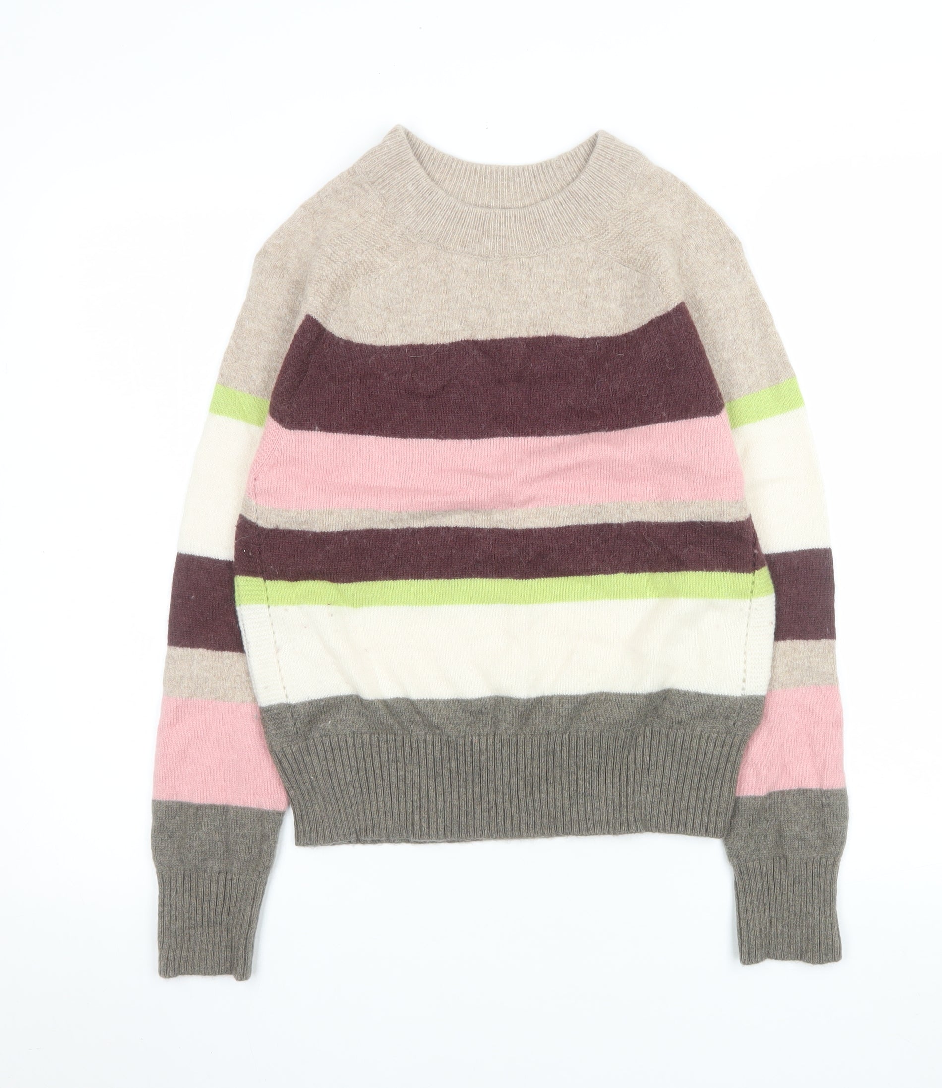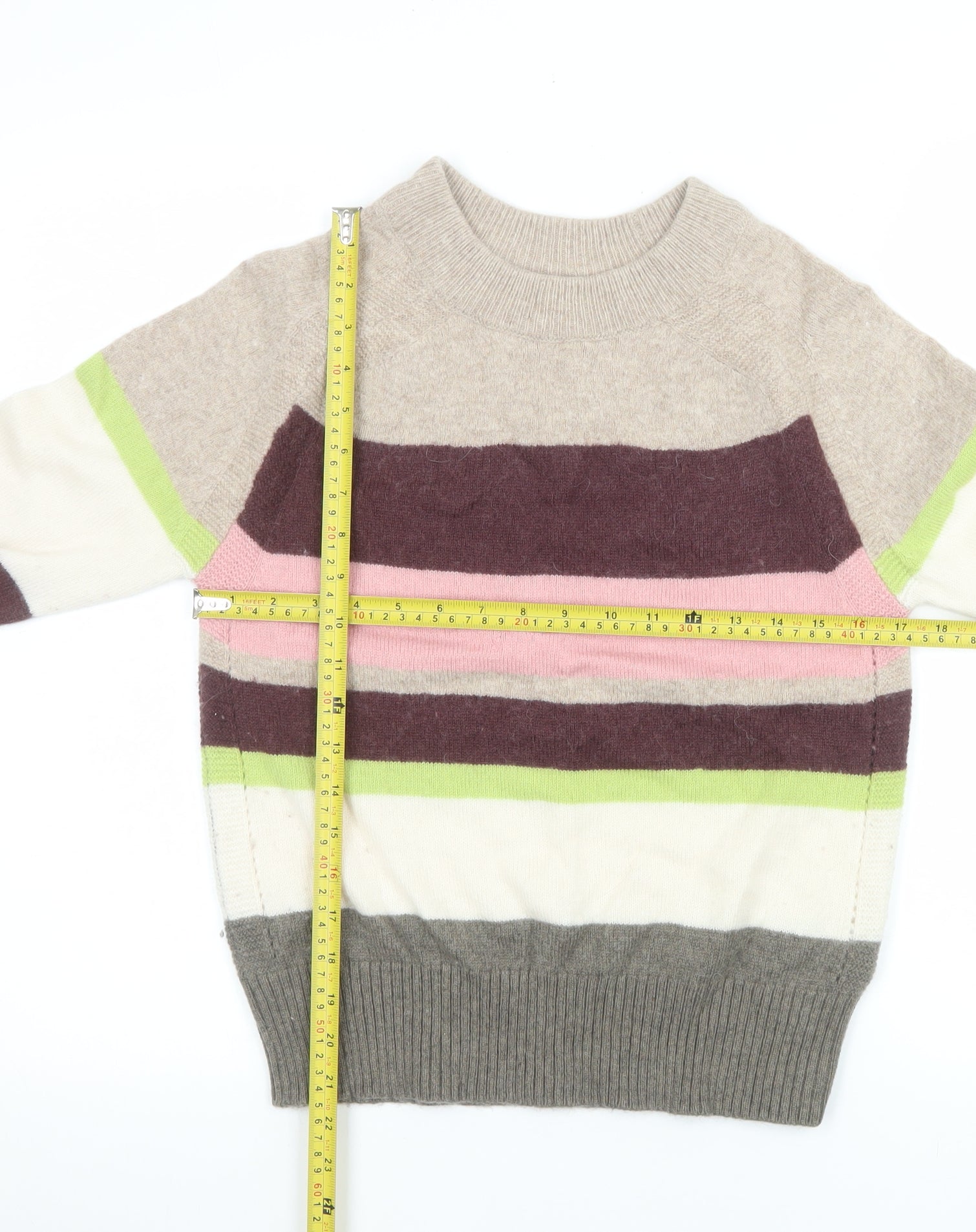 Stay effortlessly stylish and cosy in this beautiful women’s multicoloured striped jumper from NEXT. Crafted from 100% pure lambswool, this knit offers a luxuriously soft texture and a naturally breathable feel that makes it perfect for layering in the cooler seasons. The striped pattern features a playful blend of beige, burgundy, pink, lime green, cream, and grey tones, creating a lively yet versatile look that pairs wonderfully with jeans or skirts for casual everyday wear. With a classic crew neckline and long raglan sleeves, this pullover provides a comfortable and relaxed fit while maintaining a flattering shape. Designed in a fine tight-knit weave, it delivers excellent warmth without being overly heavy, making it ideal for both autumn and winter dressing. The ribbed hem, cuffs, and neckline add a touch of definition and help retain the garment’s shape wear after wear. Machine washable for easy garment care, this NEXT jumper balances practicality with premium quality. Whether you’re heading out for a relaxed weekend brunch or adding a chic layer to your workwear, this piece is a timeless wardrobe essential. The lightweight lambswool construction ensures durability and comfort, while its versatile colour palette complements any modern wardrobe. In excellent pre-loved condition with only minor signs of gentle wear, this jumper looks great and feels even better. Embrace effortless British style and dependable quality with this cosy lambswool pullover—ideal for layering, lounging, or stepping out in comfort and confidence.