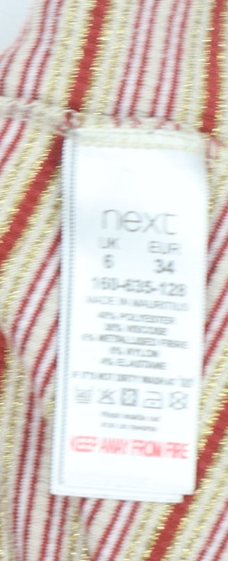This elegant women's striped roll neck top from Next offers timeless everyday style with a modern edge. Crafted from a soft and lightweight jersey material comprising polyester, viscose, metallic thread and elastane, it provides both comfort and stretch for an easy, flattering fit. The fine metallic fibres give the piece a subtle shimmer, adding a touch of sophistication that transitions effortlessly from day to evening wear.Designed in a slim fit, this long sleeve top features a classic roll neck for added warmth and an elegant silhouette. Its multicoloured horizontal stripes combine neutral and warm tones that complement any outfit across autumn and winter seasons. This versatile piece layers beautifully under blazers, pinafore dresses, or oversized knits, making it a wardrobe essential for cooler weather.Ideal for casual occasions, it pairs perfectly with jeans or skirts for a relaxed, polished look. The breathable and lightweight jersey fabric ensures comfort throughout the day, while the stretch content provides flexibility and retains its shape. The machine washable care instructions make it both stylish and practical for everyday use.In excellent pre-owned condition, showing minimal signs of gentle wear with no damage or marks, this item has been carefully inspected to ensure quality. Offering the dependable comfort and quality associated with Next garments, this roll neck striped top delivers style that works from casual meetups to cosy layered winter looks.A superb addition for anyone seeking an effortlessly stylish and wearable top that’s easy to match, comfortable, and chic.