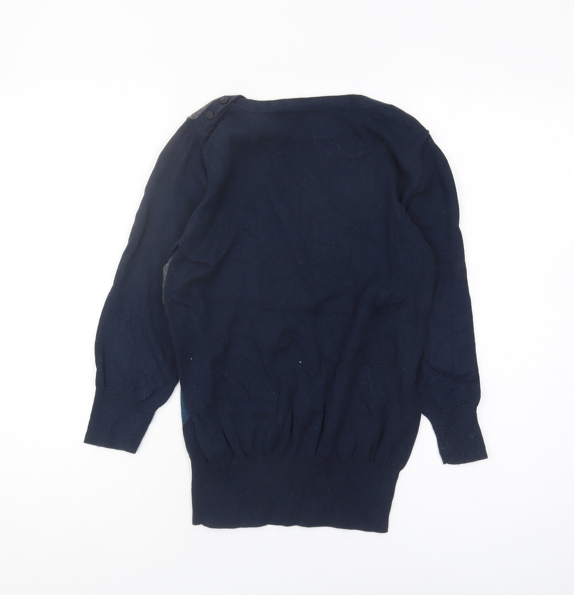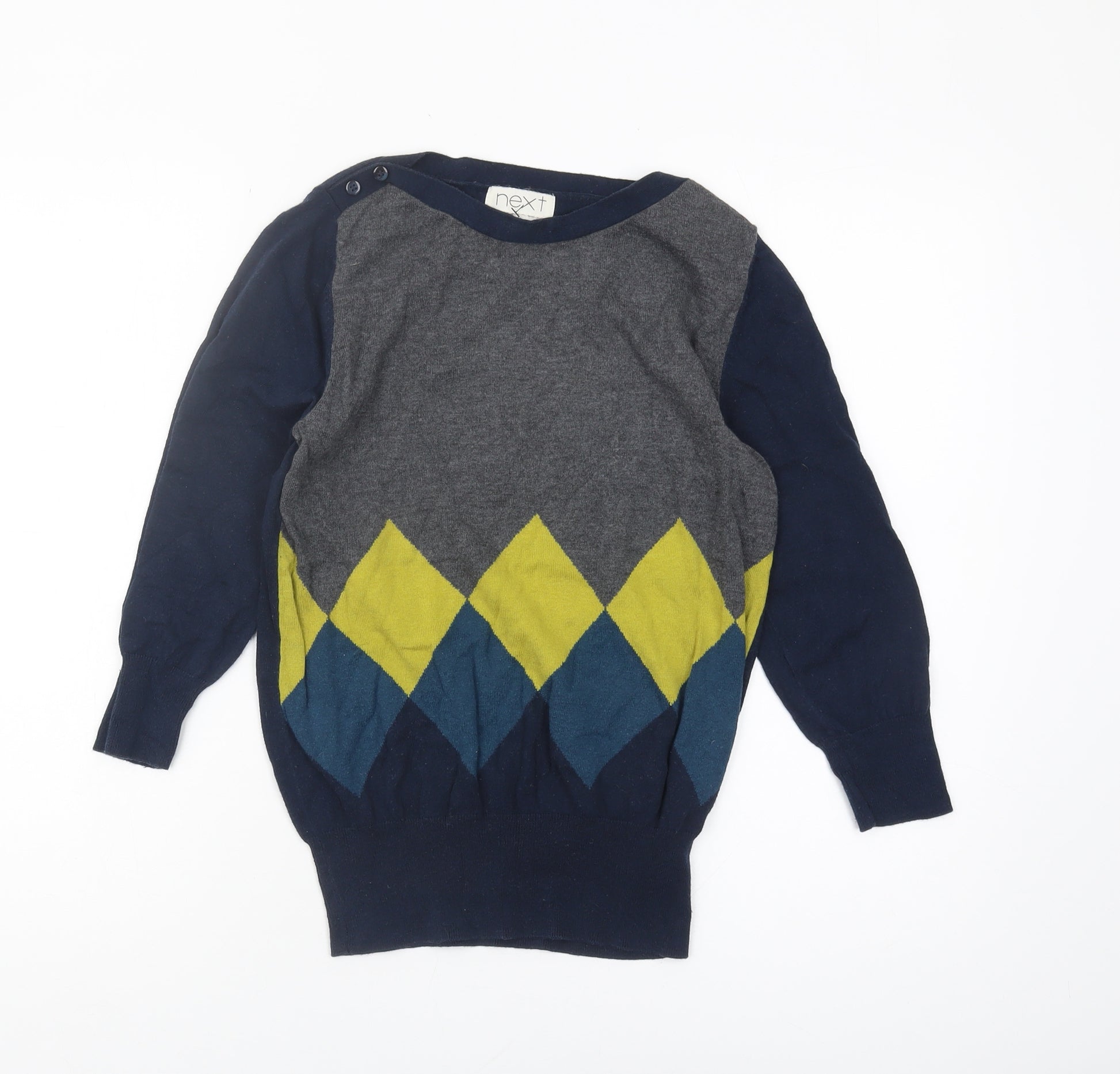 Elevate your wardrobe with this stylish women's jumper from Next, perfect for those who love classic patterns with a modern twist. Featuring a distinctive argyle design on the front, this jumper combines shades of grey and navy with striking geometric shapes in yellow and blue, offering a pop of colour to your autumn or winter outfit. Crafted from a soft and comfortable cotton and nylon blend, this long-sleeve knitwear ensures warmth and durability while maintaining a chic and fashionable look. The crew neck and button accents add a unique touch, making it an ideal choice for layering over your favourite tops. With a machine-washable fabric, caring for your garment is a breeze. Despite being pre-owned, this jumper remains in excellent condition with no noticeable defects, ensuring you enjoy style and comfort for many seasons to come. Available in UK size 10, it is perfect for the fashion-conscious woman looking to update her wardrobe with a timeless piece. Don't miss out on this versatile and affordable addition to your collection.