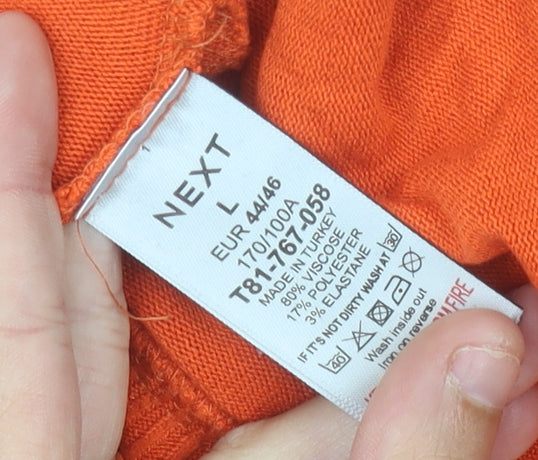 This NEXT women's orange crew neck pullover jumper is a stylish and versatile addition to any wardrobe, ideal for casual wear during the cooler seasons. Crafted from a soft and comfortable knit fabric blend of viscose, polyester, and elastane, it offers both durability and a flattering fit. The bright orange colour brings a bold pop of vibrancy to your outfit, making it perfect for adding energy to your autumn, spring, and winter looks. Designed with a classic crew neckline, this jumper provides timeless appeal, while the 3/4 sleeves offer both style and practicality, allowing for easy layering over shirts or under jackets. The regular fit ensures comfort without compromising on shape, making it suitable for everyday wear. The fabric has natural stretch thanks to the elastane content, ensuring ease of movement and a comfortable fit throughout the day. The jumper features a clean, no-pattern design, lending itself well to pairing with jeans, skirts, or tailored trousers for a variety of occasions. Whether you’re dressing down for a weekend outing or styling it up for a more polished casual work look, this jumper will serve as a reliable staple. Easy to care for, it is machine washable, so maintaining its vibrant look and soft feel is effortless. Despite being pre-owned, it is in excellent condition with only light signs of wear and mild creasing, indicating careful previous use. This piece strikes the perfect balance between comfort, functionality, and chic style, making it a valuable addition to your seasonal wardrobe. If you’re seeking a jumper that’s warm yet breathable, comfortable yet fashion-forward, this NEXT pullover is a great choice for keeping cosy while staying on-trend.