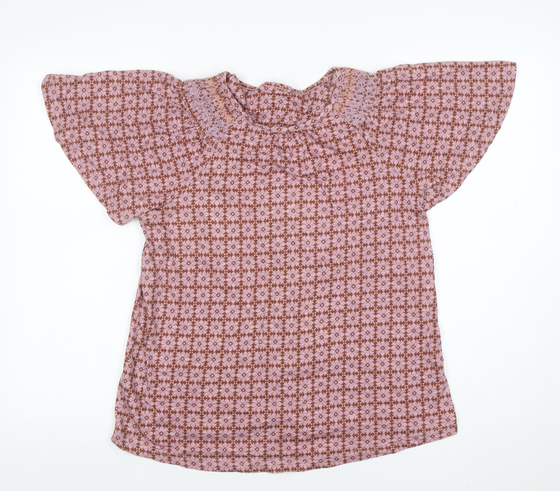 This lovely short sleeve blouse from Next offers a beautiful blend of comfort and feminine charm, perfect for everyday wear. Crafted from 100% soft cotton, the top is breathable and lightweight, making it ideal for spring and summer days. The pretty pink floral pattern gives it a timelessly feminine feel with a bohemian twist, while the relaxed tunic cut provides extra comfort and a flattering drape over the body. The round neckline and delicate crochet accents at the shoulders add a subtle touch of texture and design detail that elevate this piece beyond an ordinary top. Its flutter sleeves create a soft silhouette, enhancing natural movement and giving the blouse a breezy, romantic style. This versatile piece pairs effortlessly with jeans for a casual daytime look or with a skirt for a more put-together, weekend-ready outfit. Whether worn for casual outings, family gatherings, or relaxed holidays, this blouse will keep you feeling stylish and at ease. Machine washable for easy care, it was designed with practicality and comfort in mind. In excellent pre-owned condition, showing only minimal signs of gentle wear with no visible defects, it promises both quality and longevity. A wonderful addition to any modern woman’s wardrobe, this pink cotton blouse from Next is a must-have for those who love charming prints and classic comfort at its best. Perfect for layering or wearing alone, it’s a versatile favourite that can transition effortlessly from day to evening wear, ensuring you look polished and feel comfortable every time you wear it.