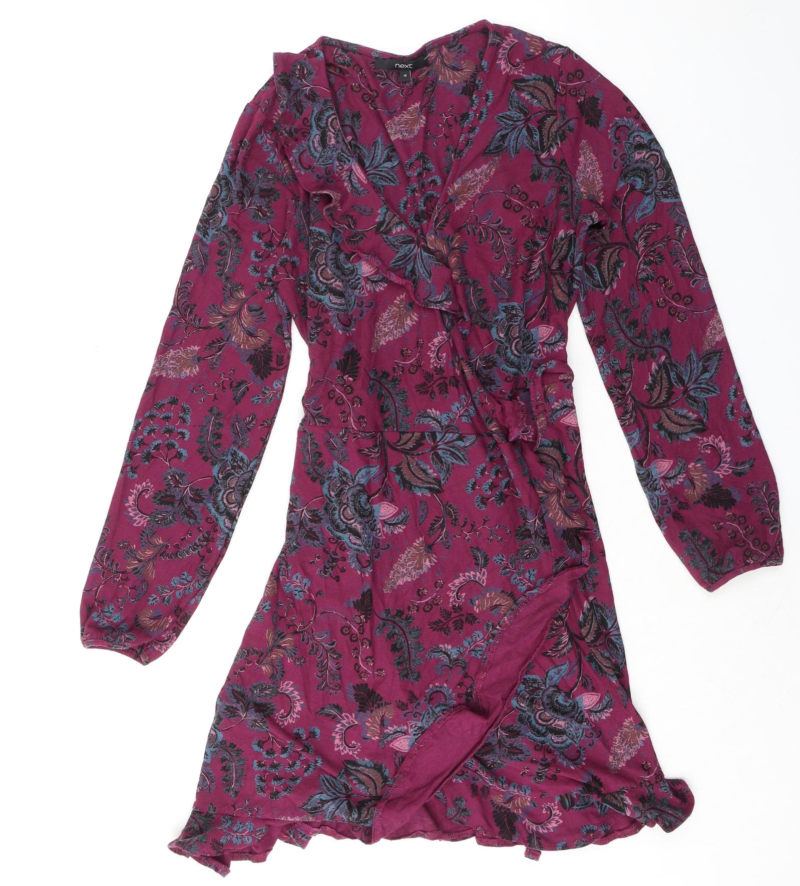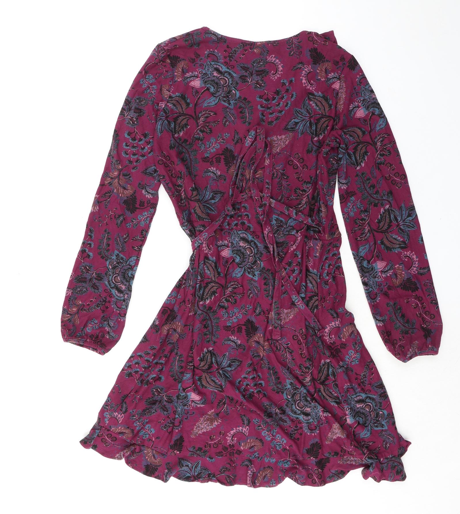 Womens Purple Floral Viscose Wrap Dress Size 12 V-Neck Pullover