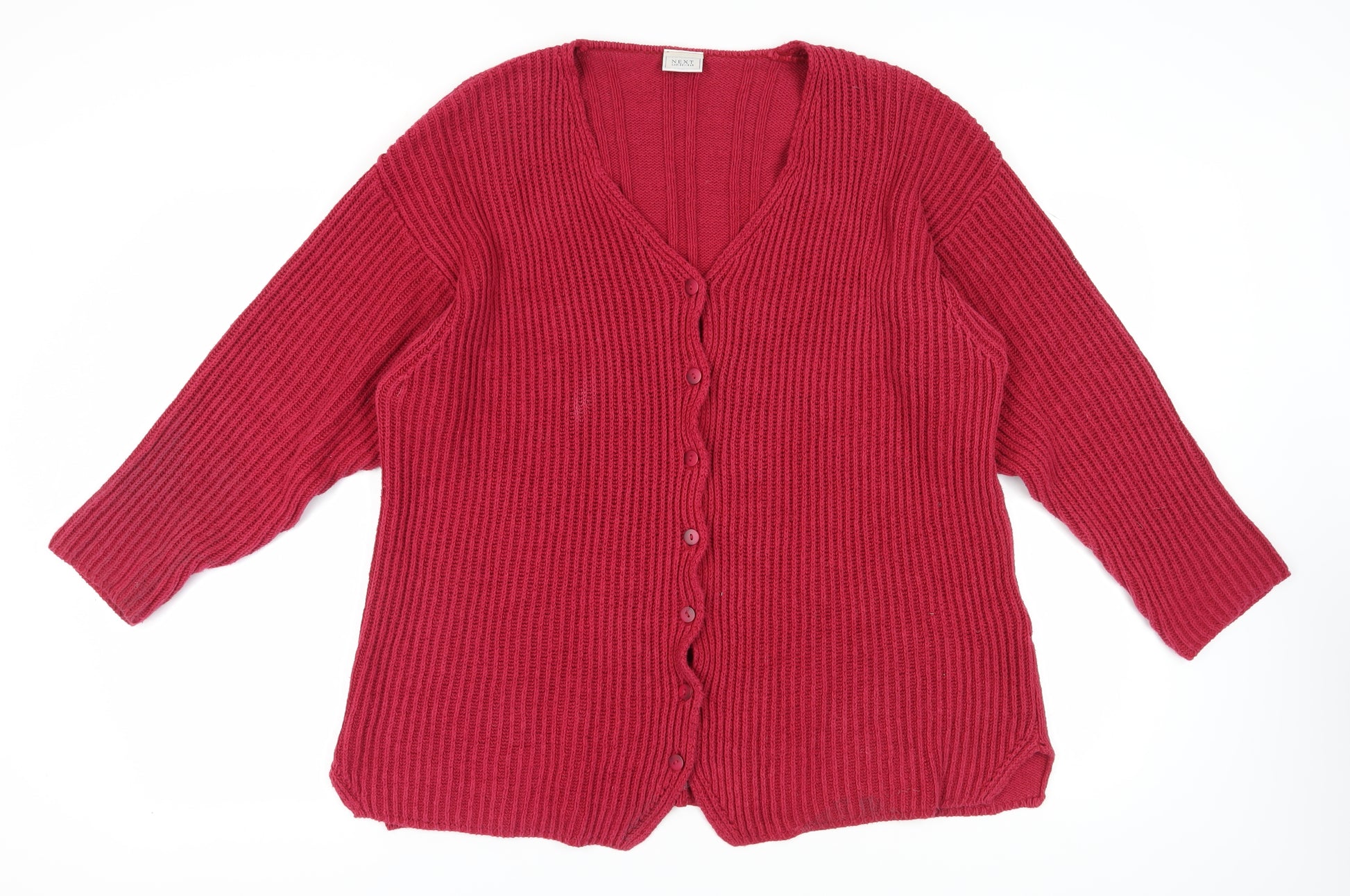 Embrace timeless style with this elegant red cardigan from Next. Perfectly designed for women seeking comfort and fashion, it features a flattering V-neck and a button accent for a classic look. Made from 100% cotton, this cardigan promises breathability and cosiness, making it ideal for all seasons. The cable-knit pattern enhances its charm, and the 3/4 sleeves provide a touch of sophistication. Whether you're out for a casual day or need an extra layer, this cardigan offers the perfect fit with its regular cut. Machine washable and easy to maintain, it's a piece that will add value to your wardrobe. This cardigan is in excellent condition, showing gentle signs of use, making it a fantastic choice for those seeking quality at an affordable price.