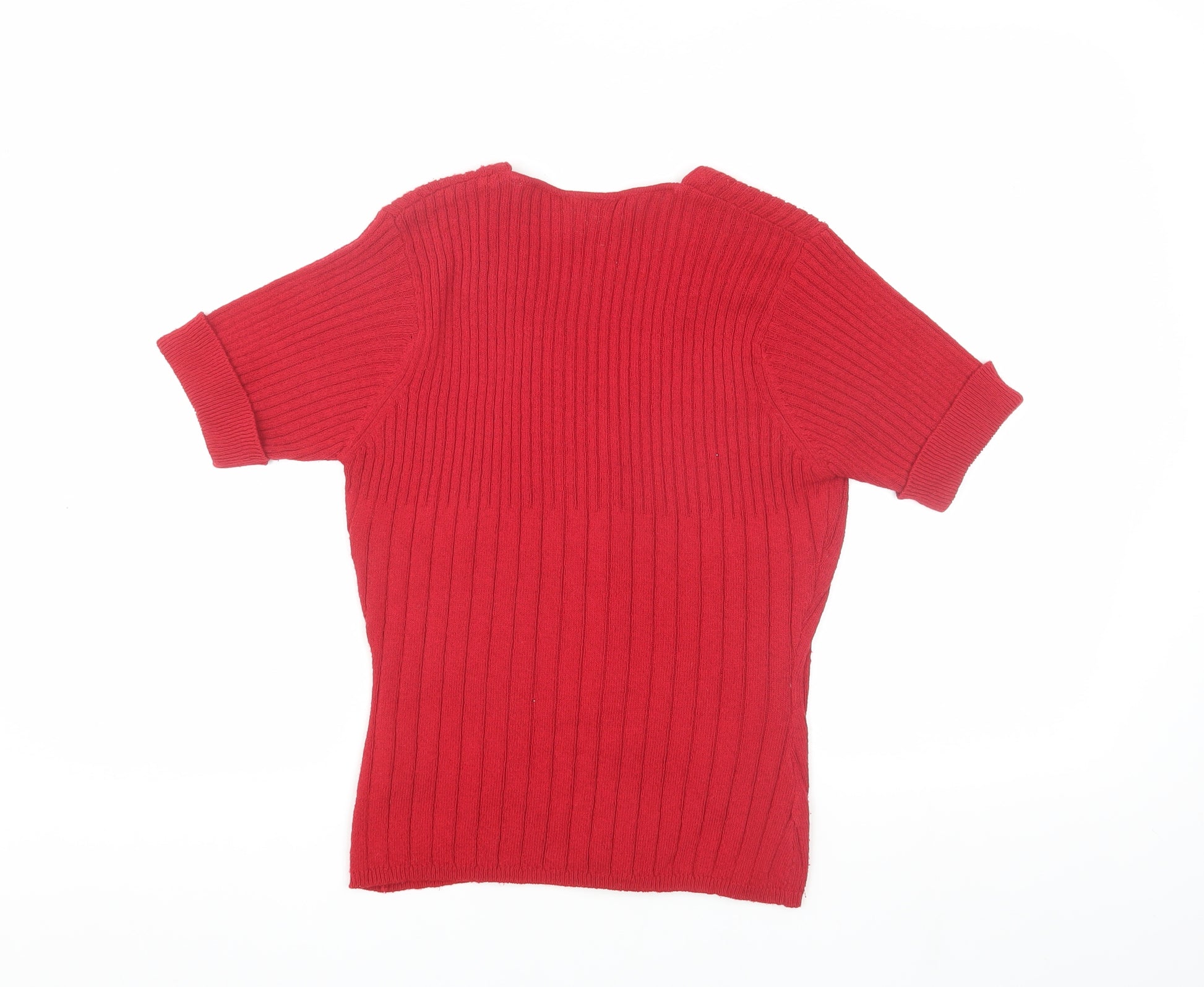 Discover the perfect blend of style and comfort with this gorgeous red cardigan from Next. Crafted with a meticulous attention to detail, this women's medium-sized cardigan is ideal for both spring and autumn. Its vibrant red colour makes a bold statement, effortlessly adding a pop of colour to any outfit. The V-neck design adds a touch of elegance, perfect for layering over your favourite tops. Featuring a button accent, this cardigan boasts a classic style, offering a timeless appeal suitable for casual settings. Made from a soft acrylic and nylon blend, it promises exceptional comfort and durability, allowing for stress-free, daylong wear. In a tight-knit pattern, it ensures a snug fit, enhancing the cardigan's stylish silhouette.The short sleeves offer a modern twist on the traditional cardigan design, making it an excellent piece for those in-between seasons. It's machine washable for easy care, making it a practical addition to your wardrobe. With its regular fit, it's designed for relaxed, everyday wear, empowering you to savour moments in effortless style. This cardigan stands in excellent condition without any visible flaws or damage, promising a quality piece at a reasonable price. Update your collection with this versatile, colourful cardigan, and experience sheer comfort accompanied by timeless style.