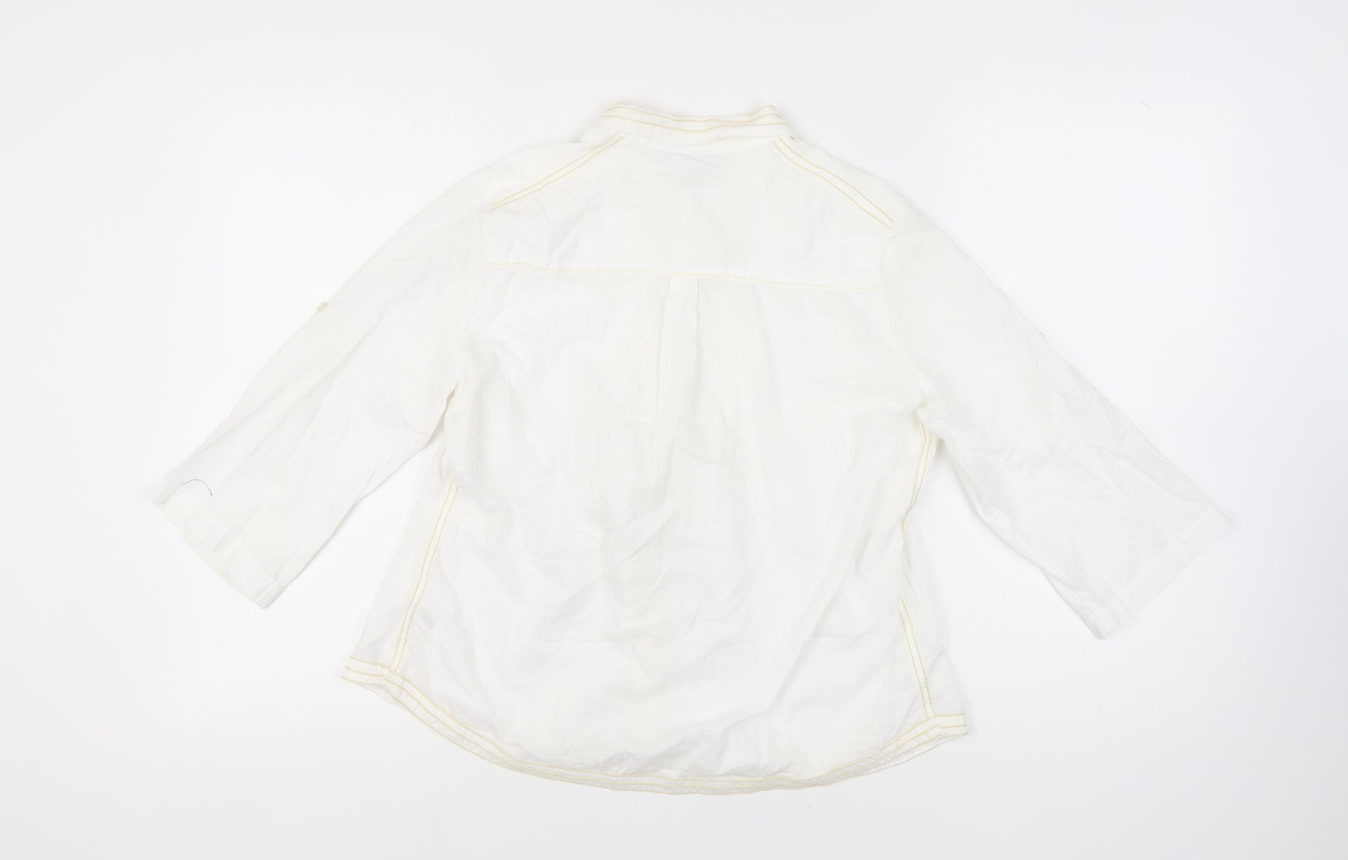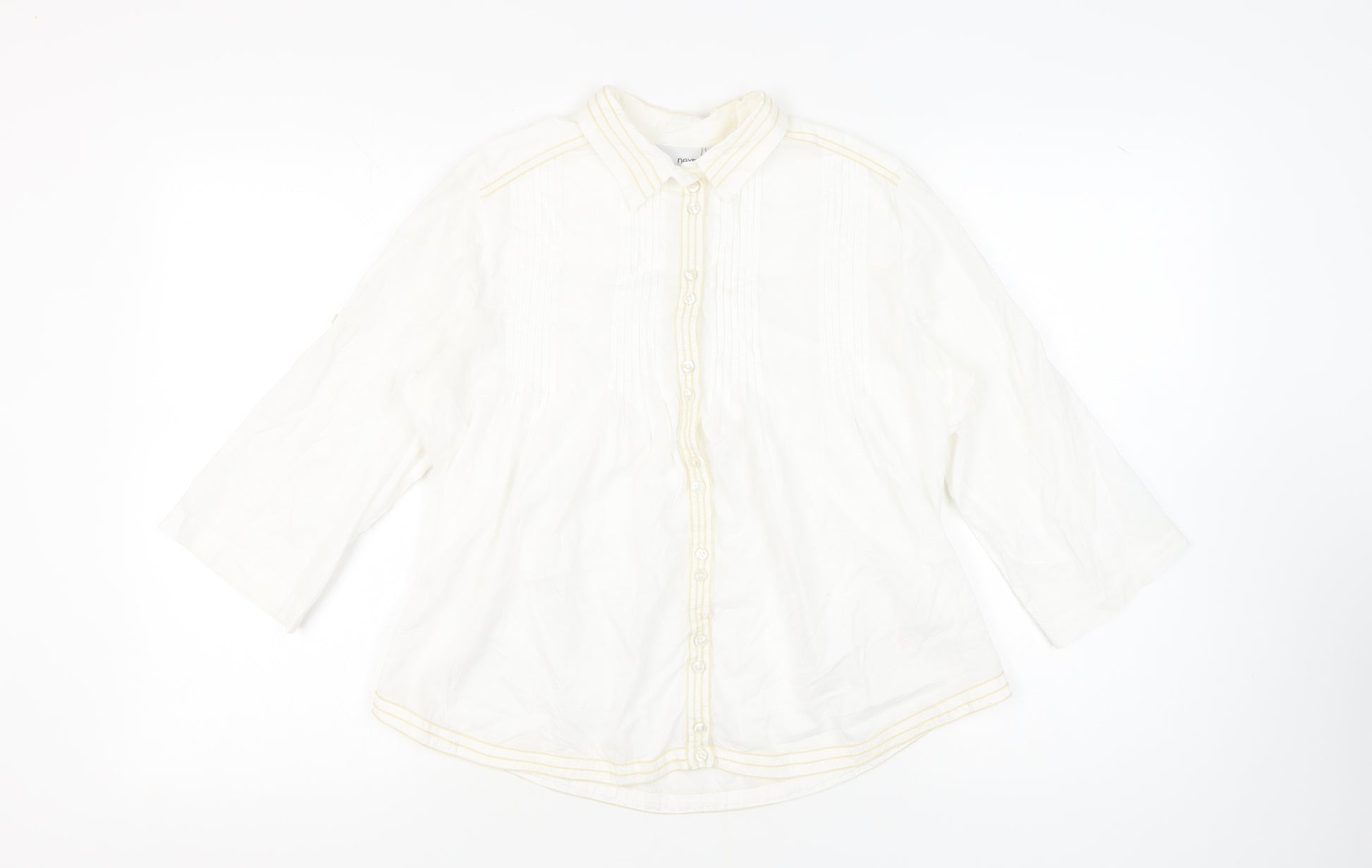 Step out in style with this elegant white button-up shirt from Next, tailored for women who appreciate a blend of comfort and fashion. Crafted from 100% cotton, this shirt offers a soft touch and is perfect for everyday wear. Its solid white hue ensures it pairs effortlessly with both casual and formal outfits. Designed in a size 14 with a regular fit, it flatters a wide range of body types. The collared neckline and 3/4 sleeves add a classic touch, making it versatile for various occasions. Whether heading to work or enjoying a day out, this shirt exudes understated elegance. The button closure provides ease of wear, and being machine washable adds to its practicality. Despite being pre-loved, it remains in excellent condition, save for being slightly wrinkled, yet free from any significant flaws. Grab this stylish piece today and elevate your wardrobe.