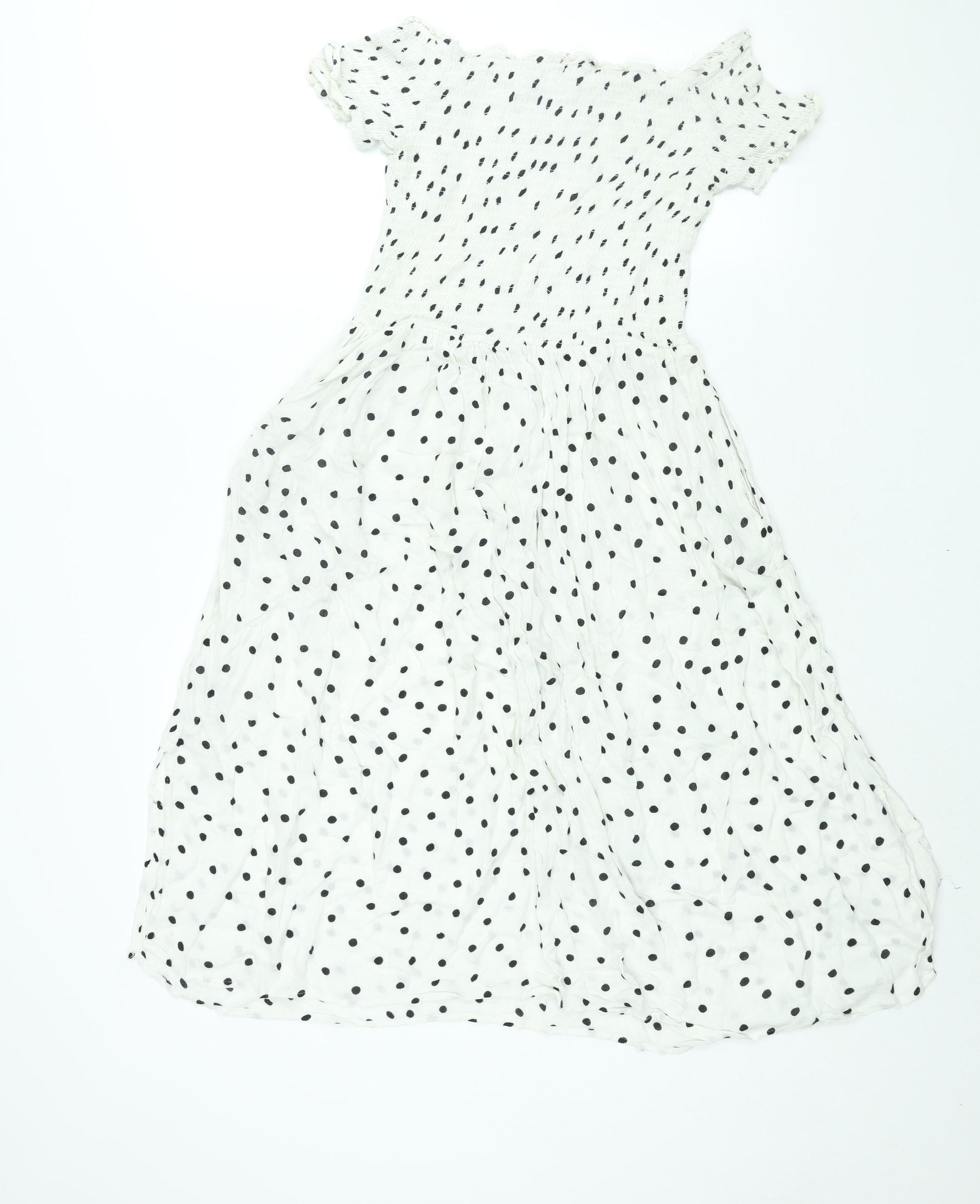 Womens White Polka Dot Viscose A-Line Size 14 Off the Shoulder Pullover - Rouched Bodice